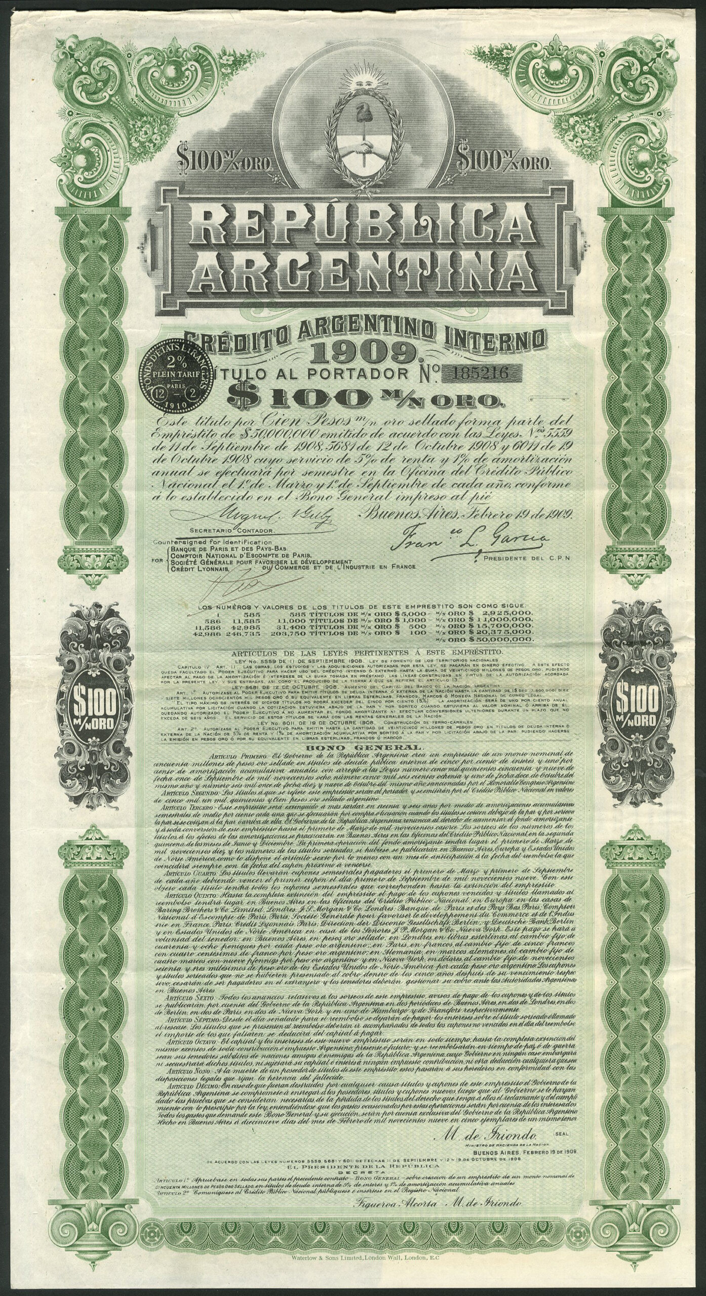 Argentina: 1909 5% Interior Loan
