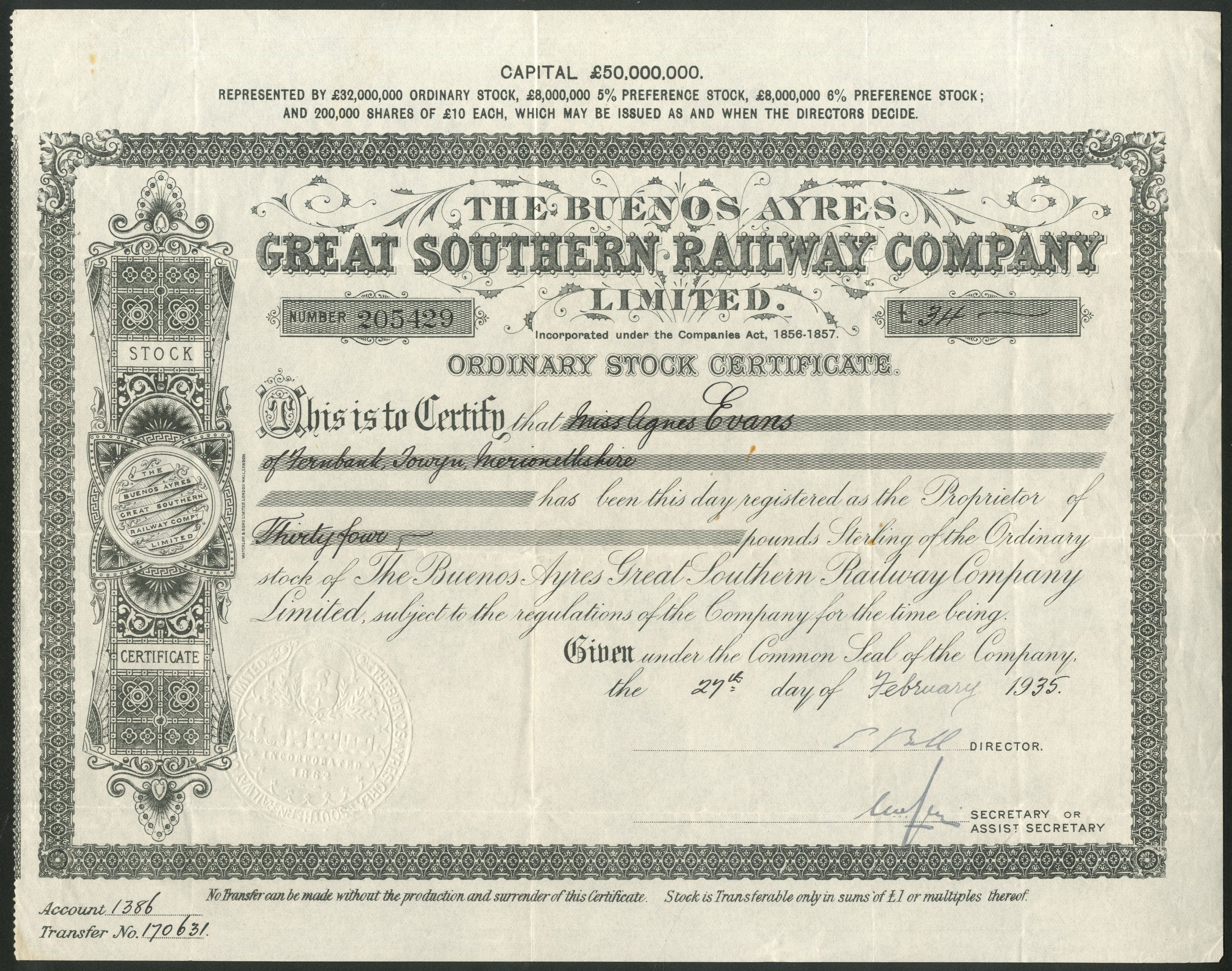 Capital by 1935 £50,000,000 in £32,000,000 ordinary stock, £8,000,000 5% preference stock and 200,000 ordinary shares of £10.