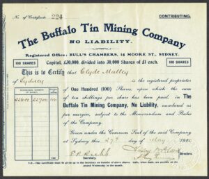 Formed to acquire the property of the Buffalo Tin Sluicing Syndicate at Emmaville. Seems to have been active until the late 1920’s
