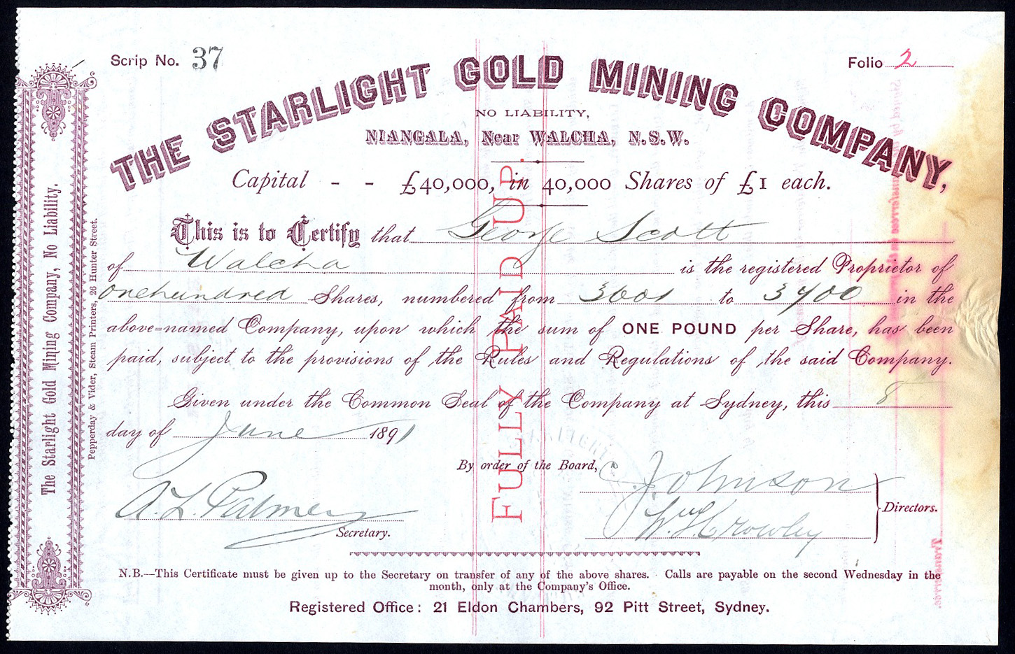 Registered in New South Wales, mines at Niangala, near Walcha, New South Wales.