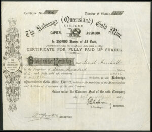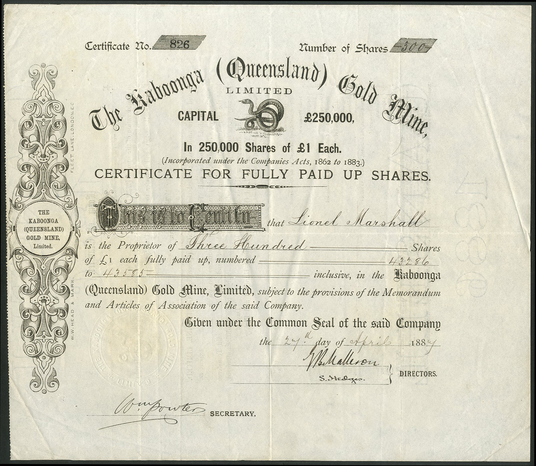 Registered 27th October 1886 to acquire the Kaboonga mine, Kaboonga Creek, Kilkivan, Queensland. In voluntary liquidation 7th September 1889. Reconstructed as the the Kaboonga Mining Co., Ltd. Company number 23339