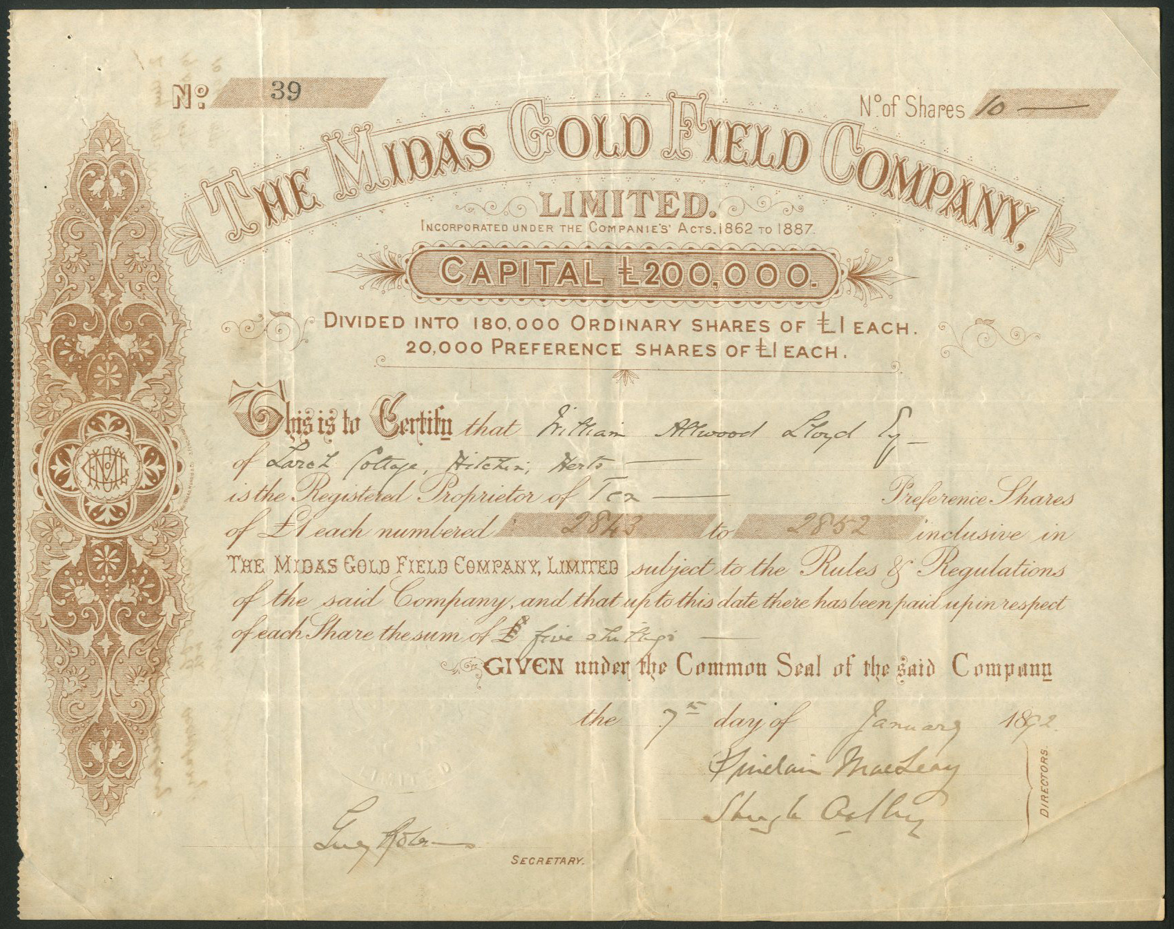 Registered 1st February 1888 to acquire the 882 acre Midas Mine in Ascot Parish, Ballarat, Victoria. Dissolved <1916. Company number 25804