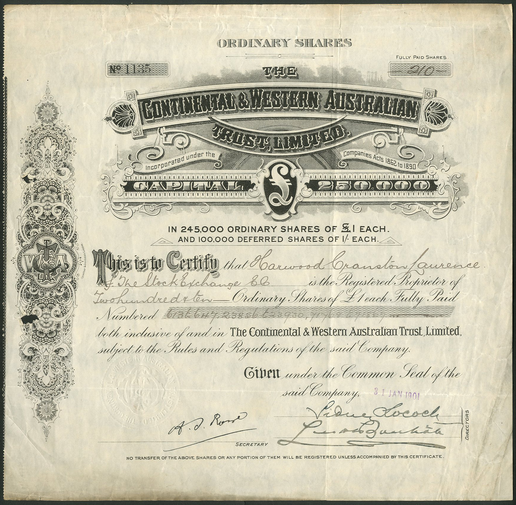 Registered 17th August 1895 as Continental & Western Australian Trust Ltd. Acquired properties in Western Australia but they were unprofitable so they were abandoned and other property in West Africa were acquired. Name changed to Continental Gold Trust Limited in July 1901. Dissolved <1916. Company number 44951