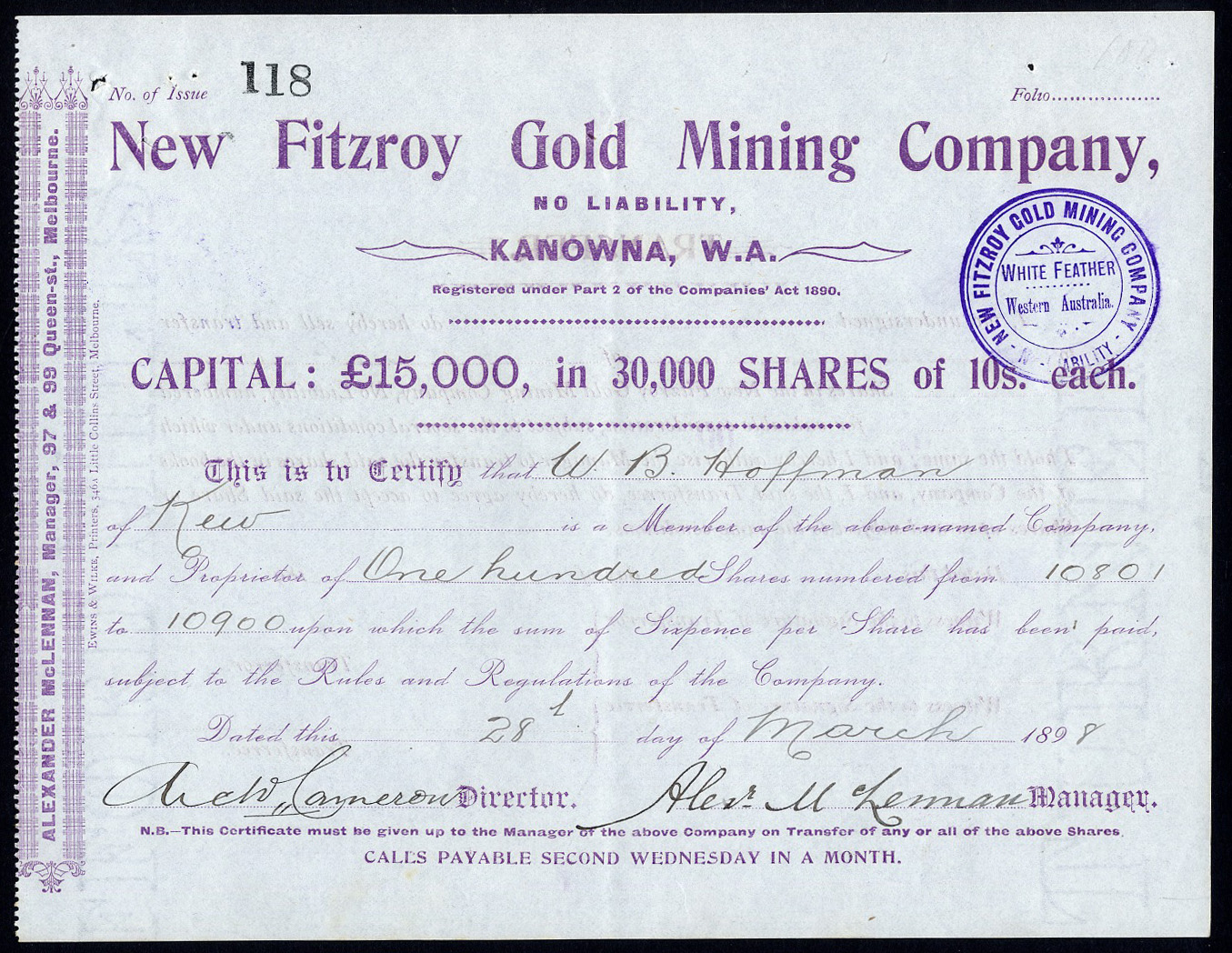 Registered in Melbourne before 1898. Mines at Kanowna, Western Australia.
