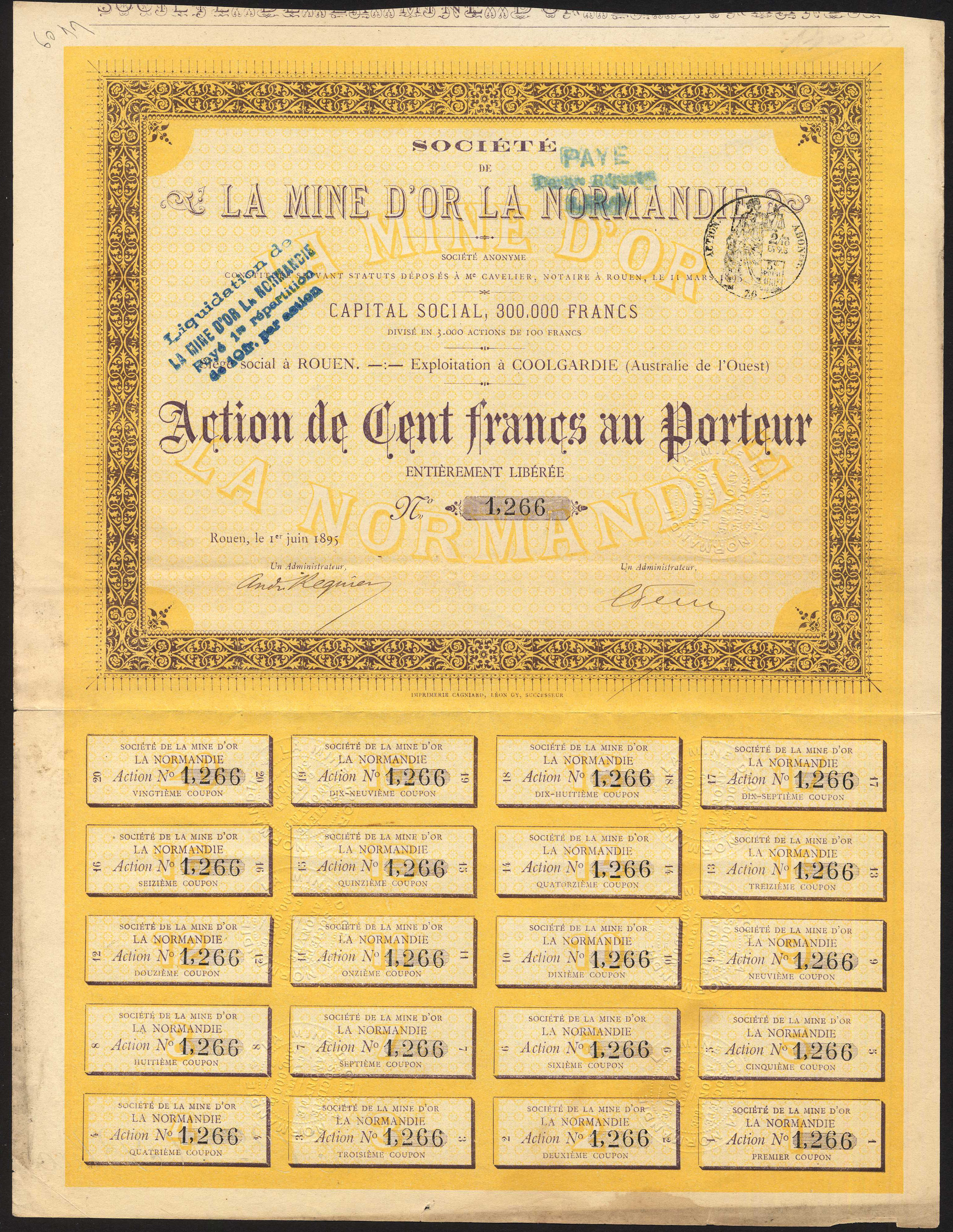 Formed in Rouen in 1895 to operate a gold mine in Coolgardie, Western Australia. Capital 300,000 francs in shares of 100 francs.
