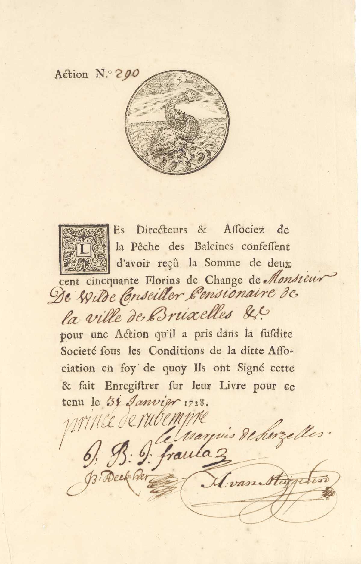 Formed in Brussels in 1727, under a concession granted by Kaiser Karl VI of Austria to hunt for whales. The whole capital was subscribed by only 9 persons. The whale-fishing vessels sailed from Ostend to Greenland and Spitzbergen; on their return the catch was sold by auction. Certificates are signed by five of the shareholders, including the Prince de Rubempre (today part of the Mérode family) and the Marquis de Herzelles (Boone Auctions).