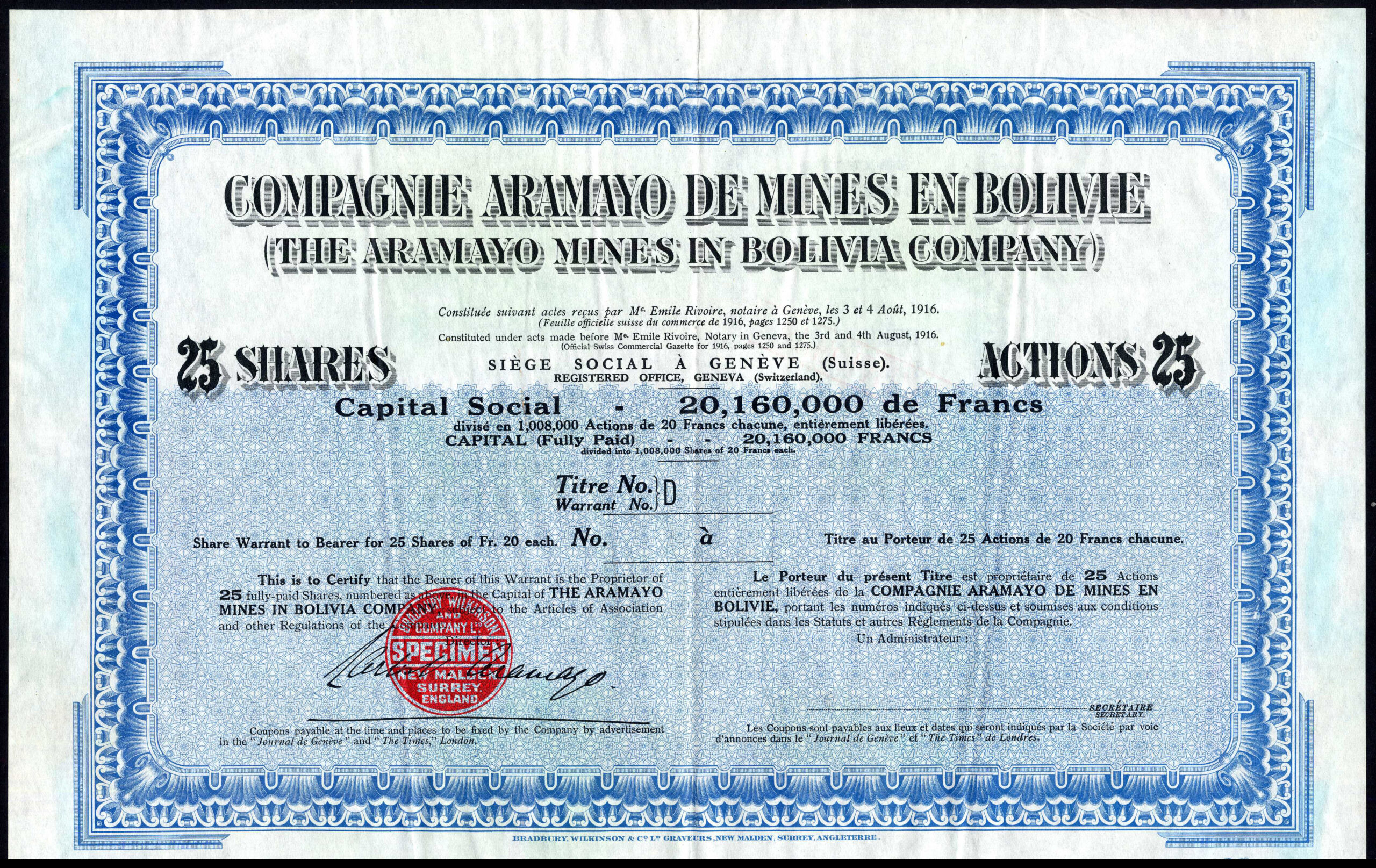 | 103s | 25 shares | [1916], specimen, blue, printed by Bradbury Wilkinson | ? | £50 |