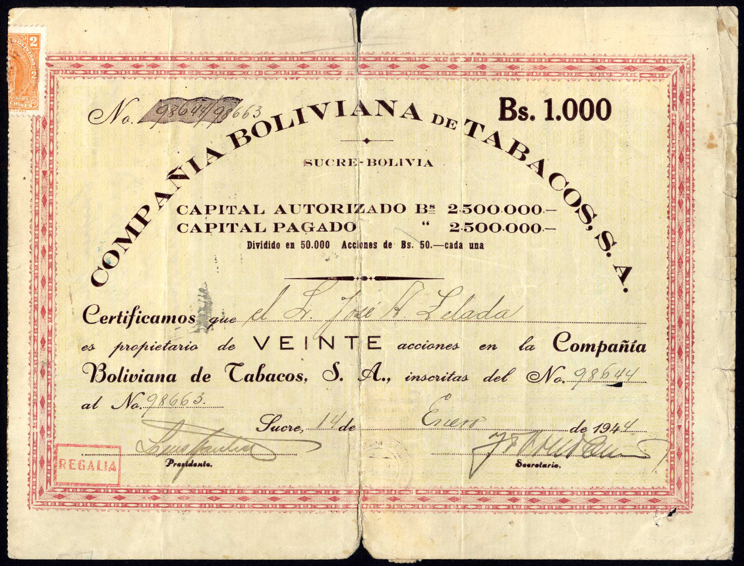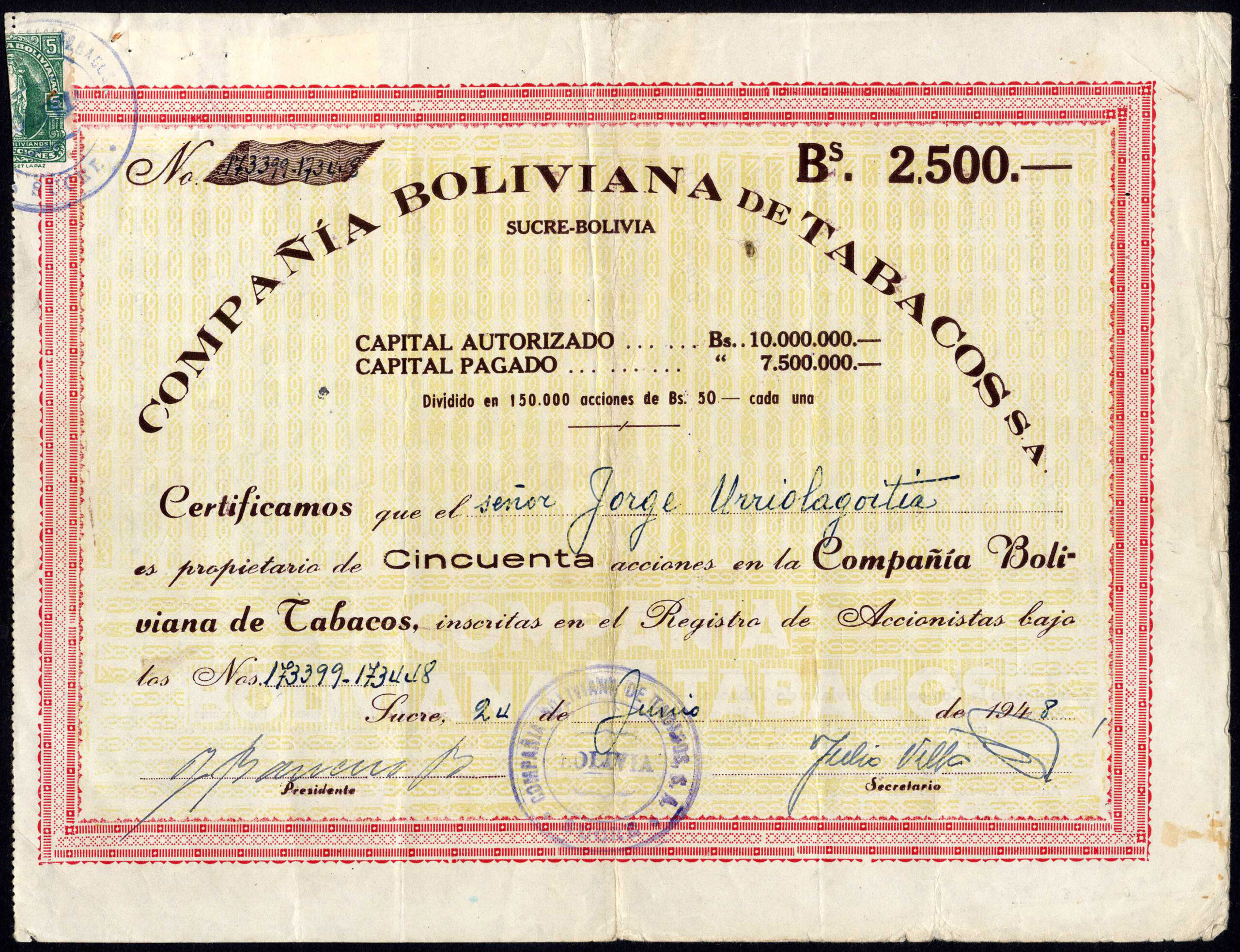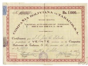 Capital 2,500,000 Bolivianos in shares of 50 Bolivianos. increased to 10,000,000 Bolivianos, paid up 7,500,000 Bolivianos in shares of 50 Bolivianos.