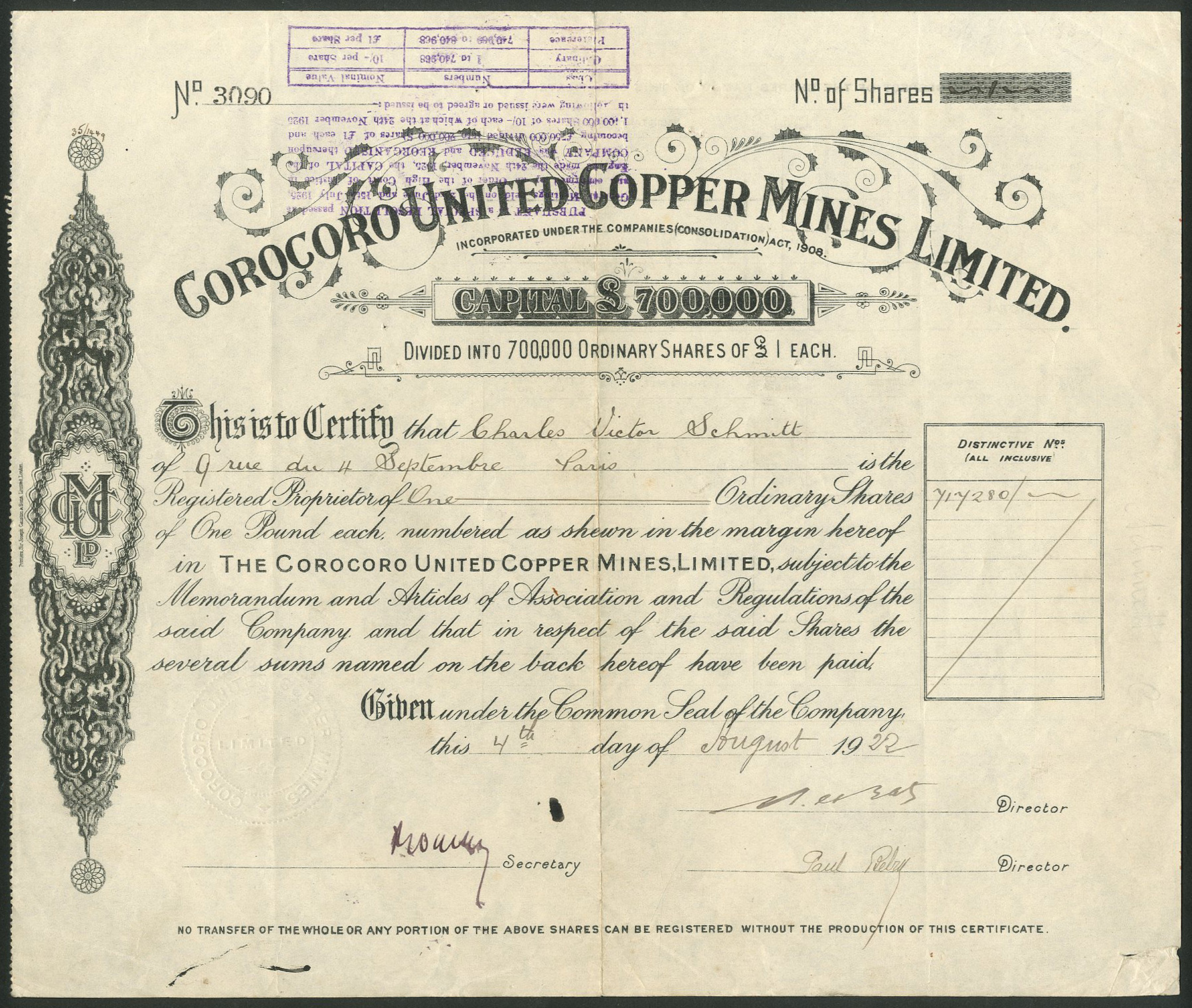 Registered in London by 1911. Copper Mines in Bolivia.