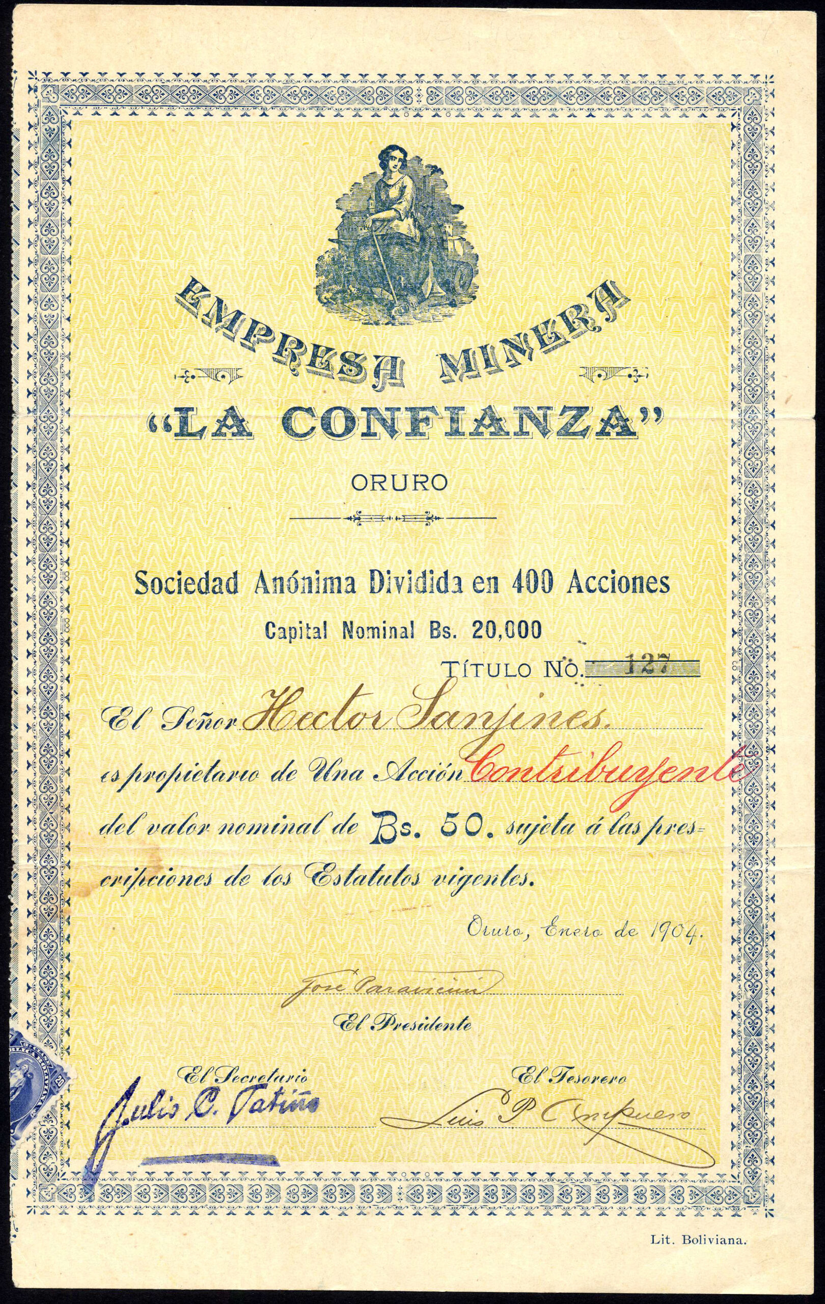 Capital 20,000 bolivianos in shares of 50 bolivianos.