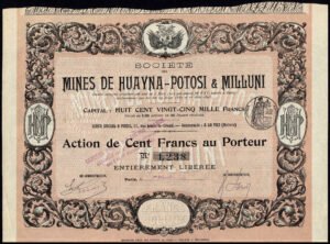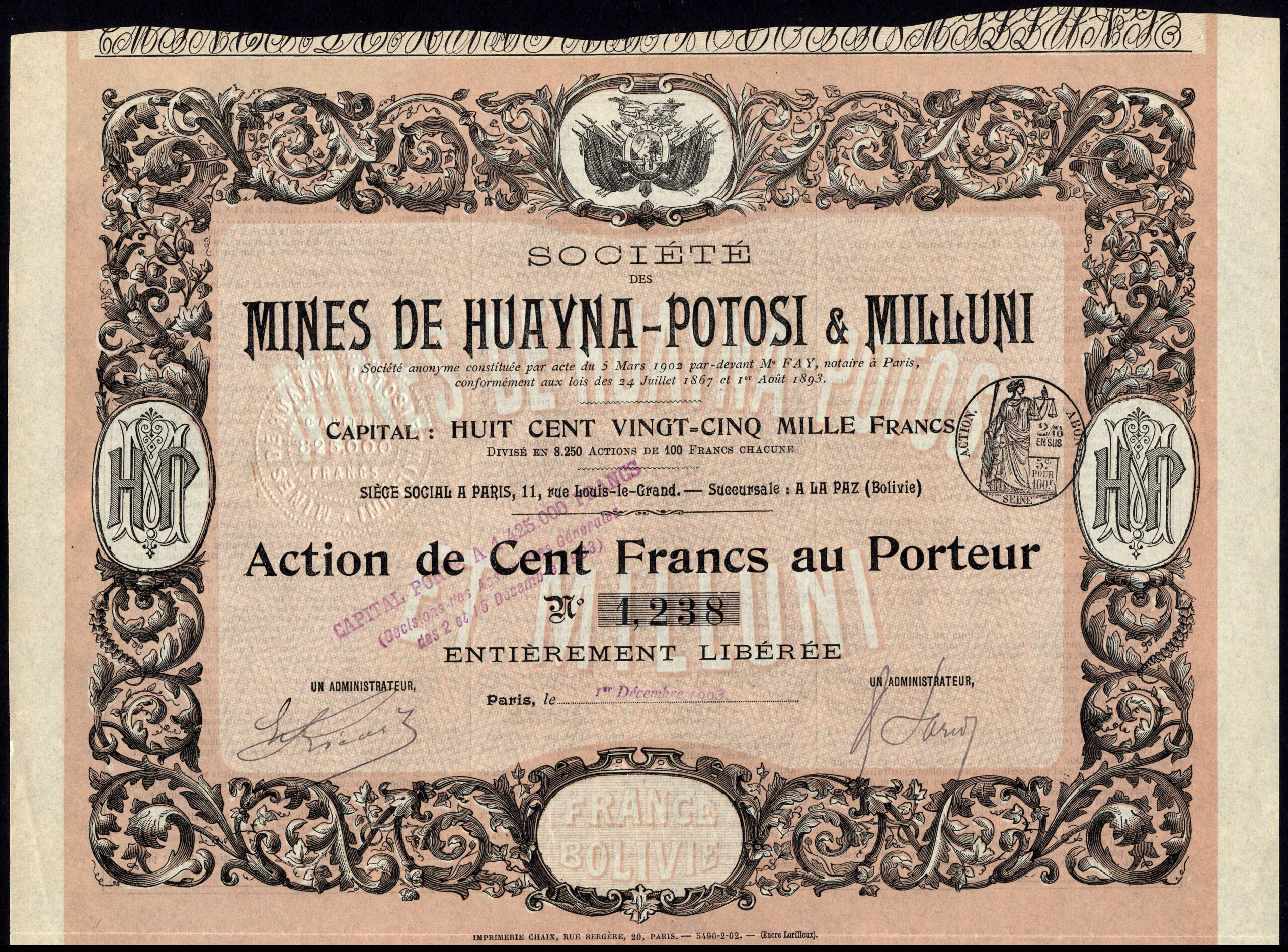 Formed in Paris in 1893 with office in La Paz, Bolivia. Capital 825,000 francs in shares of 100 francs.