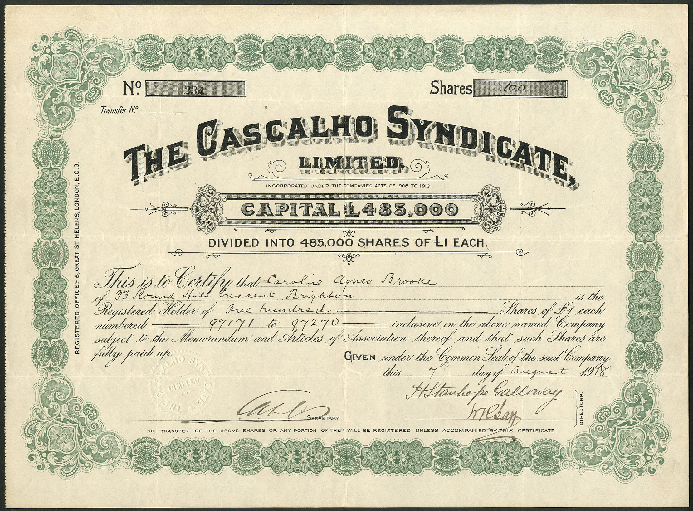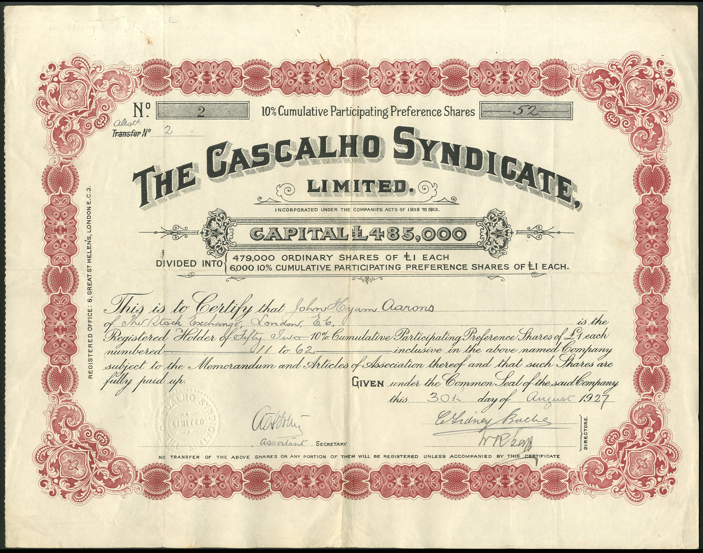 Capital originally £90,000 in 3500 ‘A’ shares and 5500 ‘B’ shares of £10. By 1918 had increased to £485,000 in shares of £1. By 1927 6000 of the ordinary shares were converted to 10% Cumulative Participating Preference shares of £1.