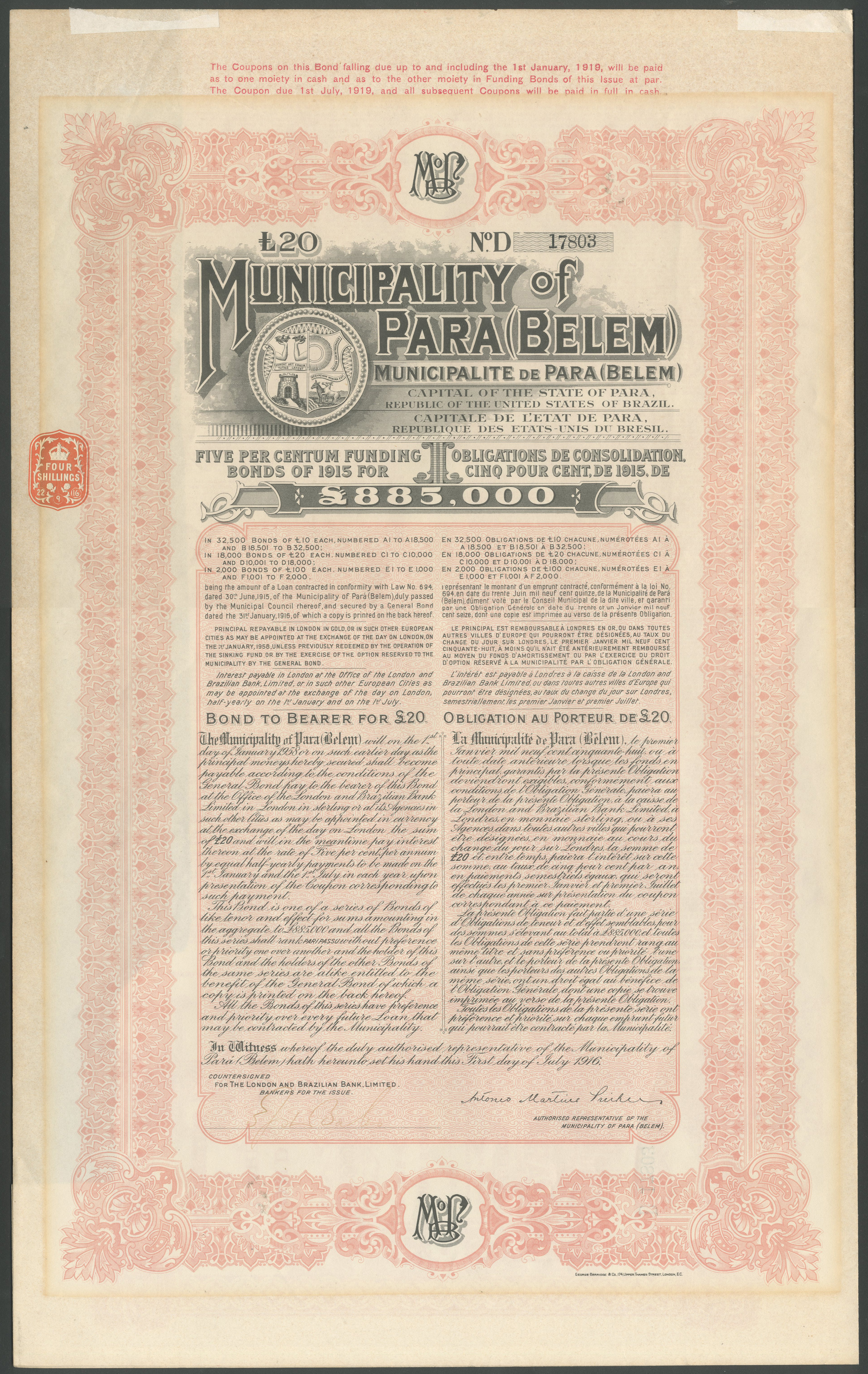 Municipalty of Pará (Belem), 1915, 5% Funding Bonds