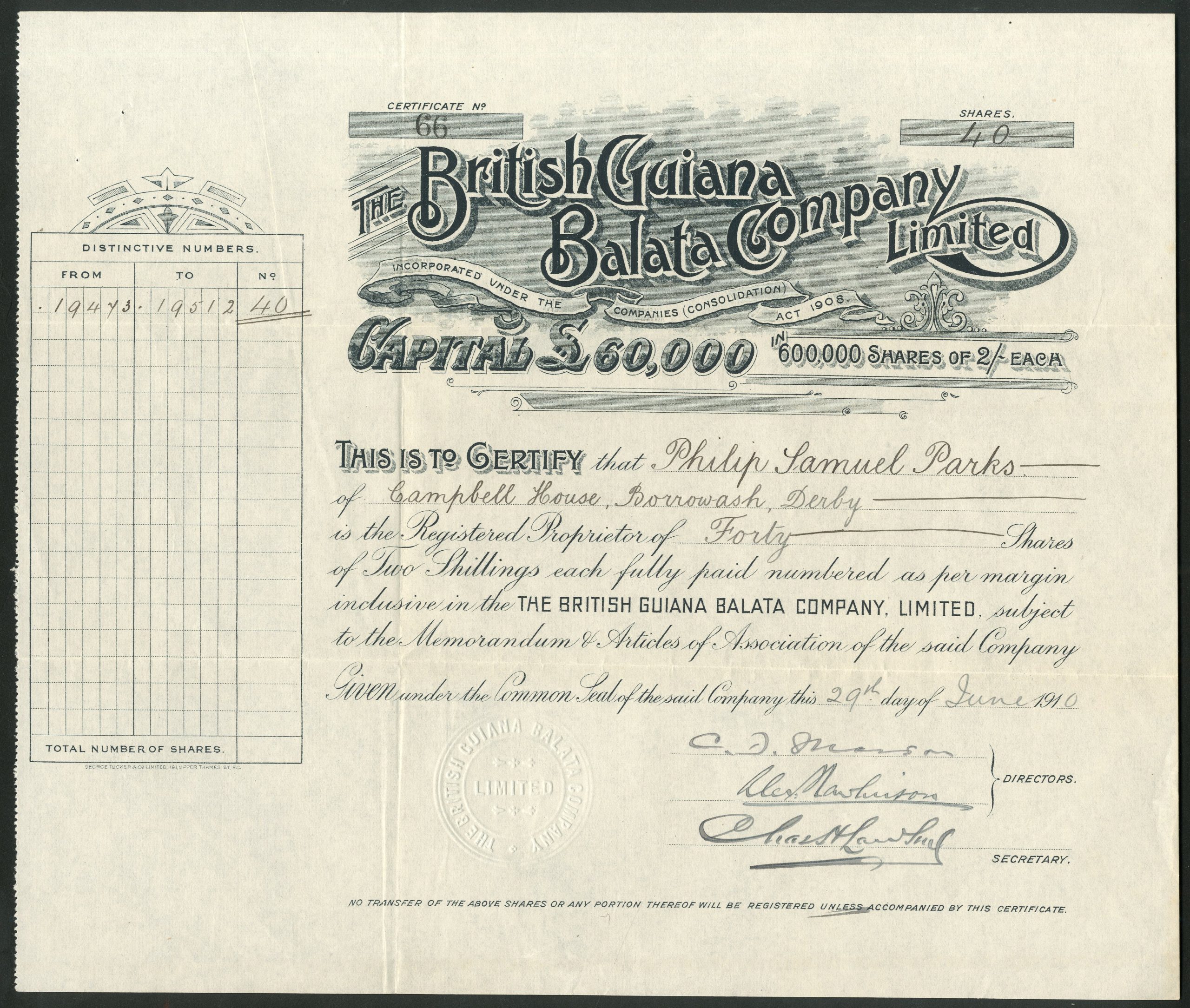 Registered 1910. Balata plantation, a rubber alternative, often used in the manufacture of golf balls.Dissolved <1932. Company number 109496
