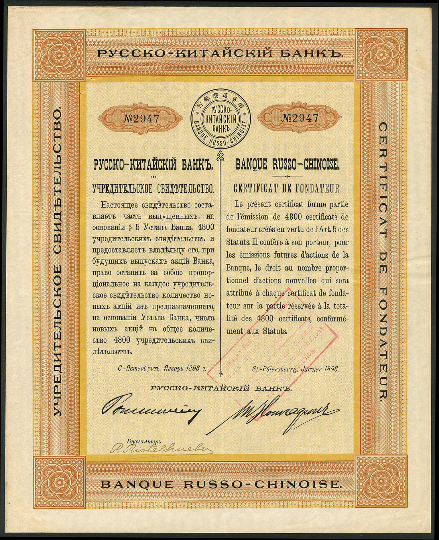 The bank was founded in 1895 with Russian and French capital. Its main offices were in St Petersburg and Shanghai. The bank lent money to China and issued Chinese government bonds to finance China for its indemnity to Japan after the First Sino-Japanese War. In 1896, the bank co-financed the construction of the China Eastern Railway. By 1902, it had become the second largest bank in China. In 1910, the bank merged with Banque du Nord to form Russo-Asiatic Bank.