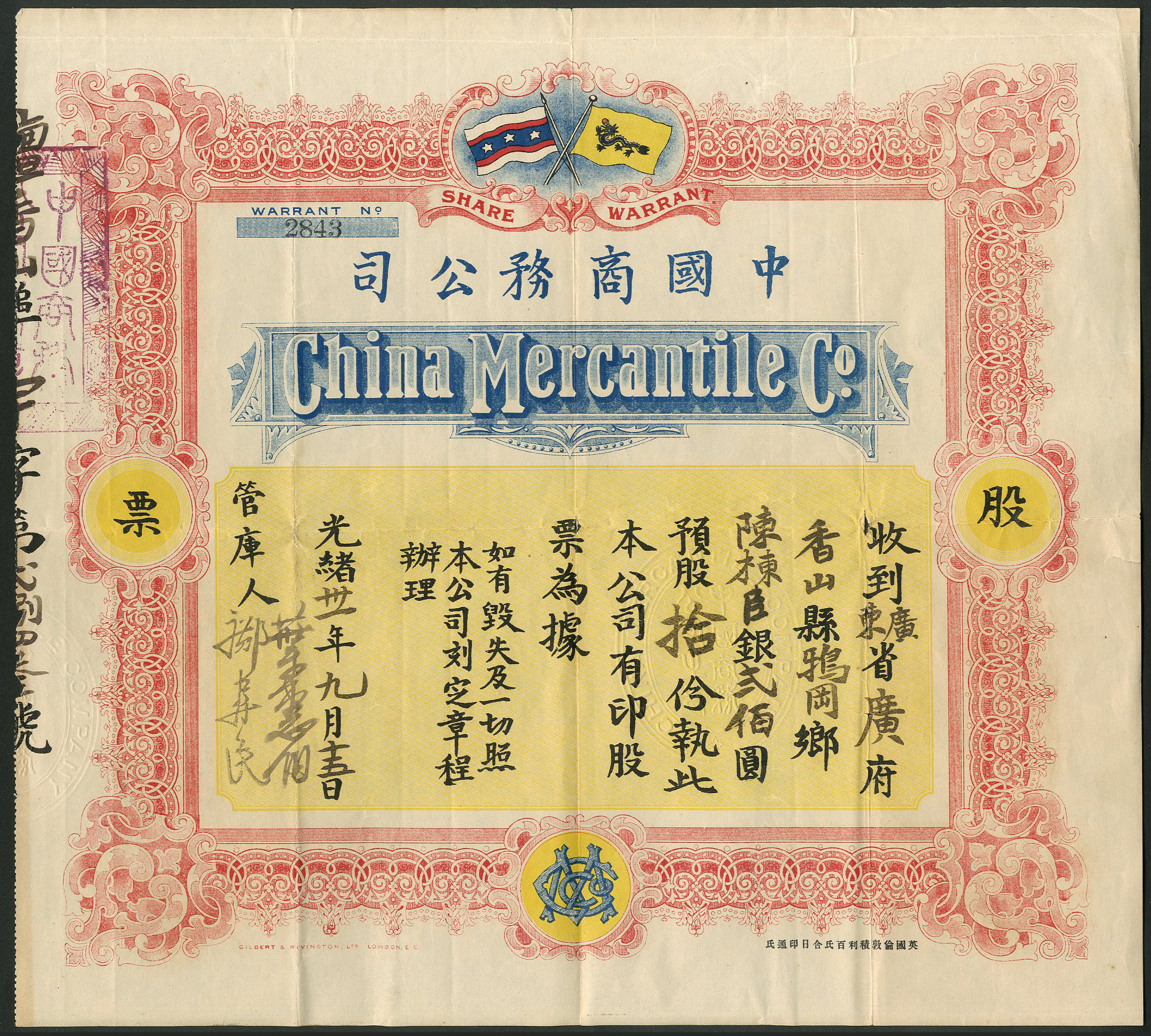 101 | $20 shares | 1905, red, blue and yellow, printed in London | #2843 | VF | £7500 |