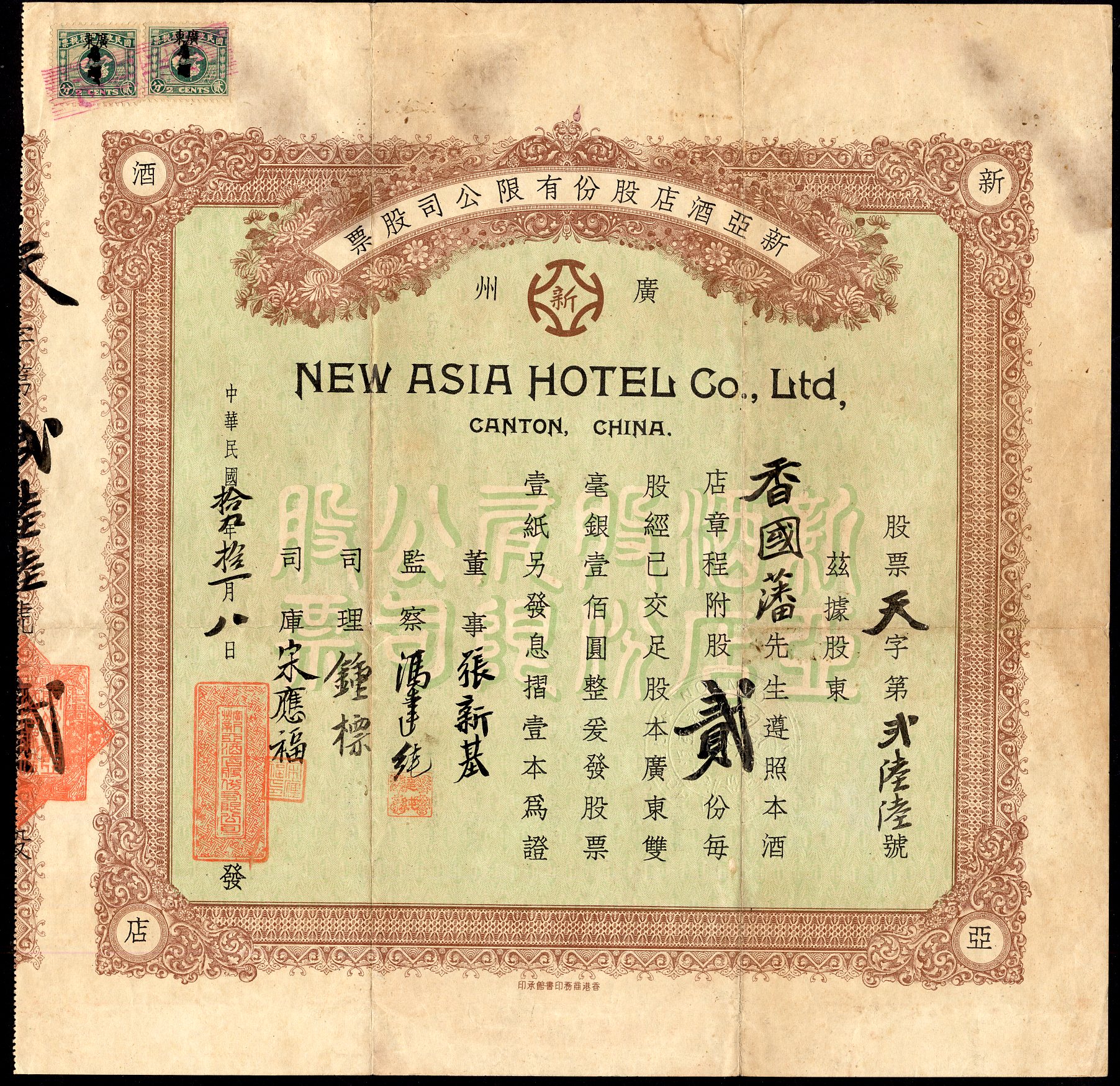 Registered in China circa 1930. Hotel in Canton. See also New Asia Hotel Limited.