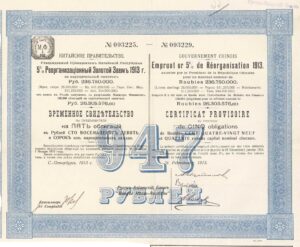 1913 5% Reorganisation Gold Loan. Issued £25,000,000 by the international banking group, each countersigning the bonds at the bottom left. £7,416,680 was issued by the Hongkong & Shanghai Banking Corporation in London, £7,416,660 by the Banque de L’Indo-Chine in Paris, £6,000,000 by the Deutsch-Asiatische Bank in Germany and £2,777,780 by the Russo-Aisatic Bank in St.Petersburg & Paris and a further £1,388,880 through their branch in Brussels. Japan, represented by the Yokohama Specie Bank, did not receive their own bonds to countersign but were able to issue any of the bonds in Japan.