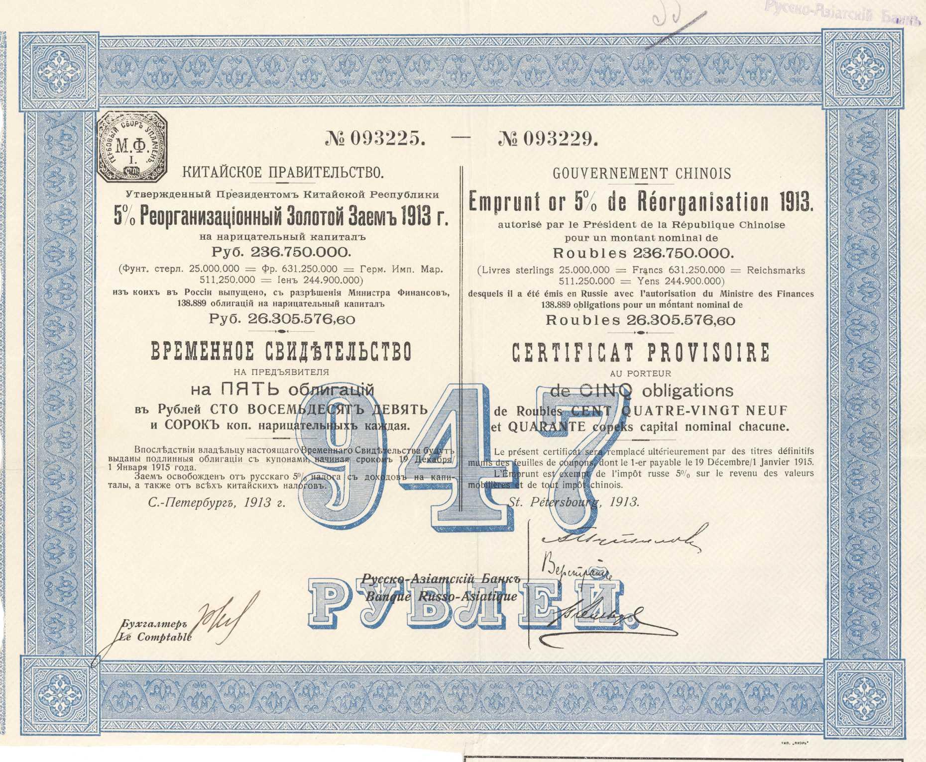 1913 5% Reorganisation Gold Loan. Issued £25,000,000 by the international banking group, each countersigning the bonds at the bottom left. £7,416,680 was issued by the Hongkong & Shanghai Banking Corporation in London, £7,416,660 by the Banque de L’Indo-Chine in Paris, £6,000,000 by the Deutsch-Asiatische Bank in Germany and £2,777,780 by the Russo-Aisatic Bank in St.Petersburg & Paris and a further £1,388,880 through their branch in Brussels. Japan, represented by the Yokohama Specie Bank, did not receive their own bonds to countersign but were able to issue any of the bonds in Japan.
