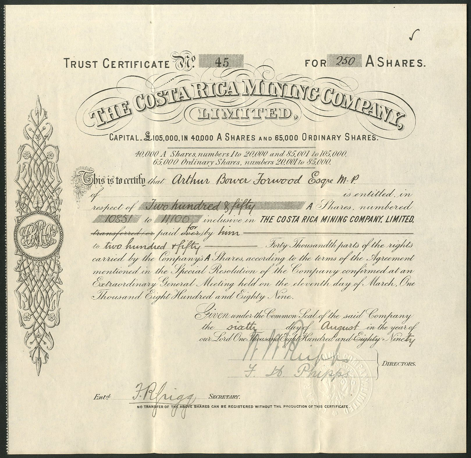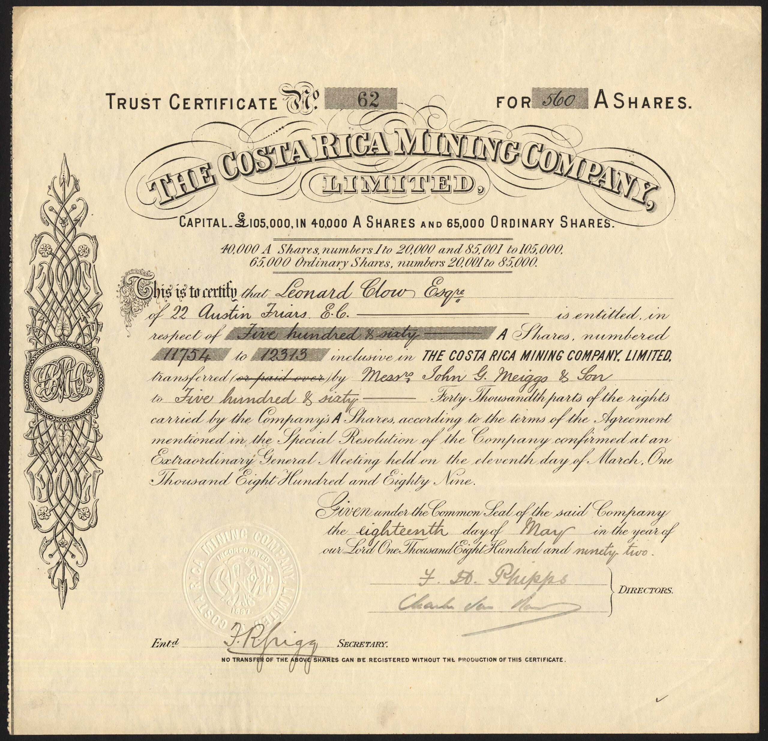 Registered 19th August 1887 to acquire land between Esparata and Puntarenas and the Trinidad mine. Dissolved <1932. Company number 24932