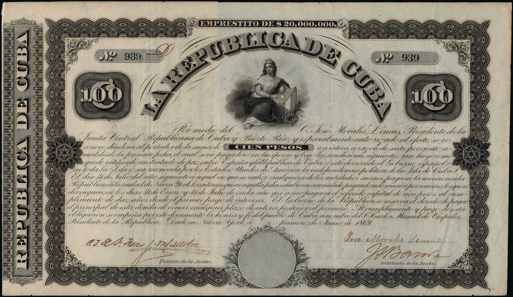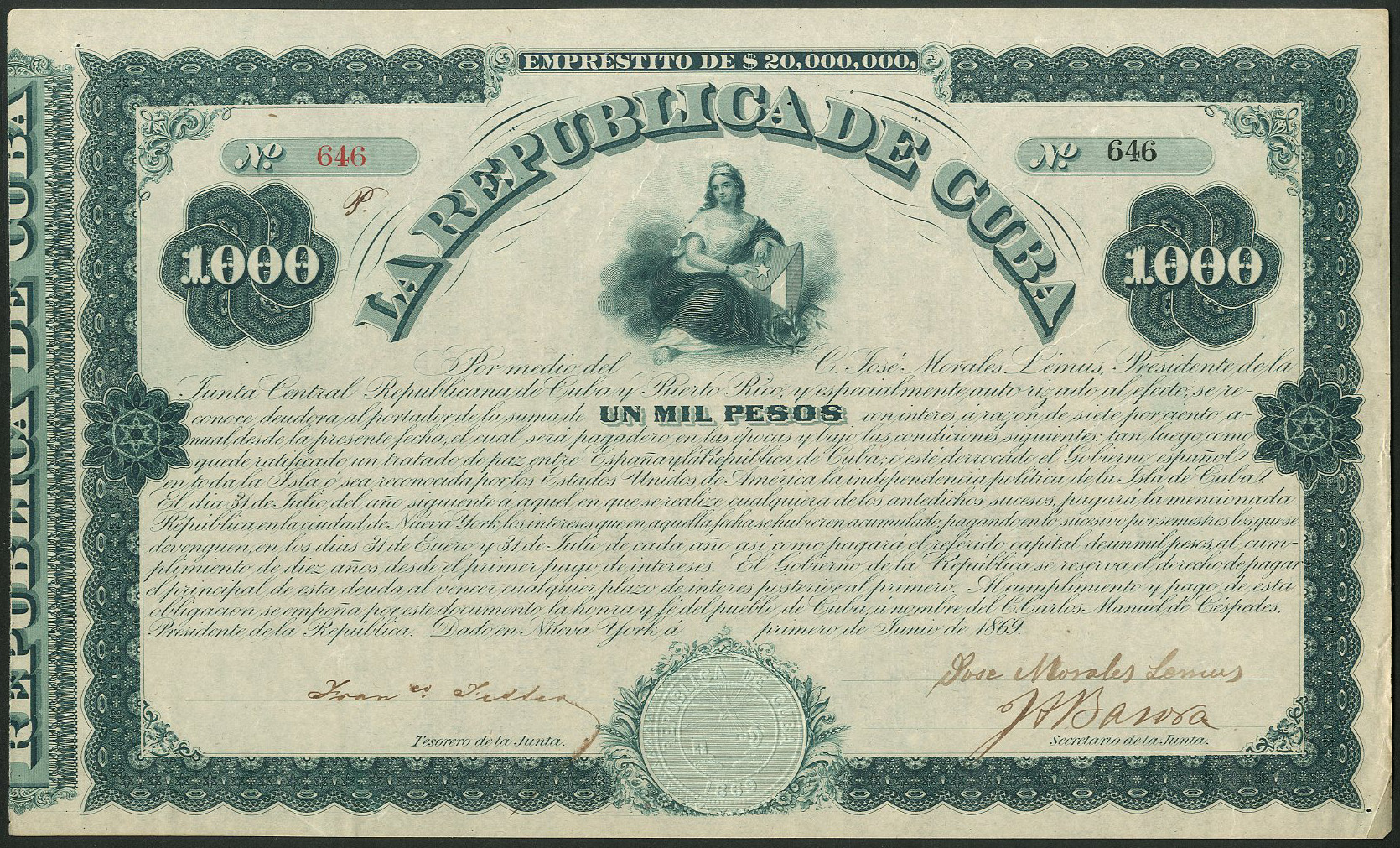 Authorised $20,000,000 pesos. Loan raised in New York to fight the 10-years war against Spanish rulers between 1868 and 1878 which was unsuccessful. Two further wars ensued culminating in the Spanish American War of 1898 when Spain lost its control over Cuba. Jose Morales Lemus , who usually signs these certificates was a wealthy lawyer and Independence figure who died in 1870.