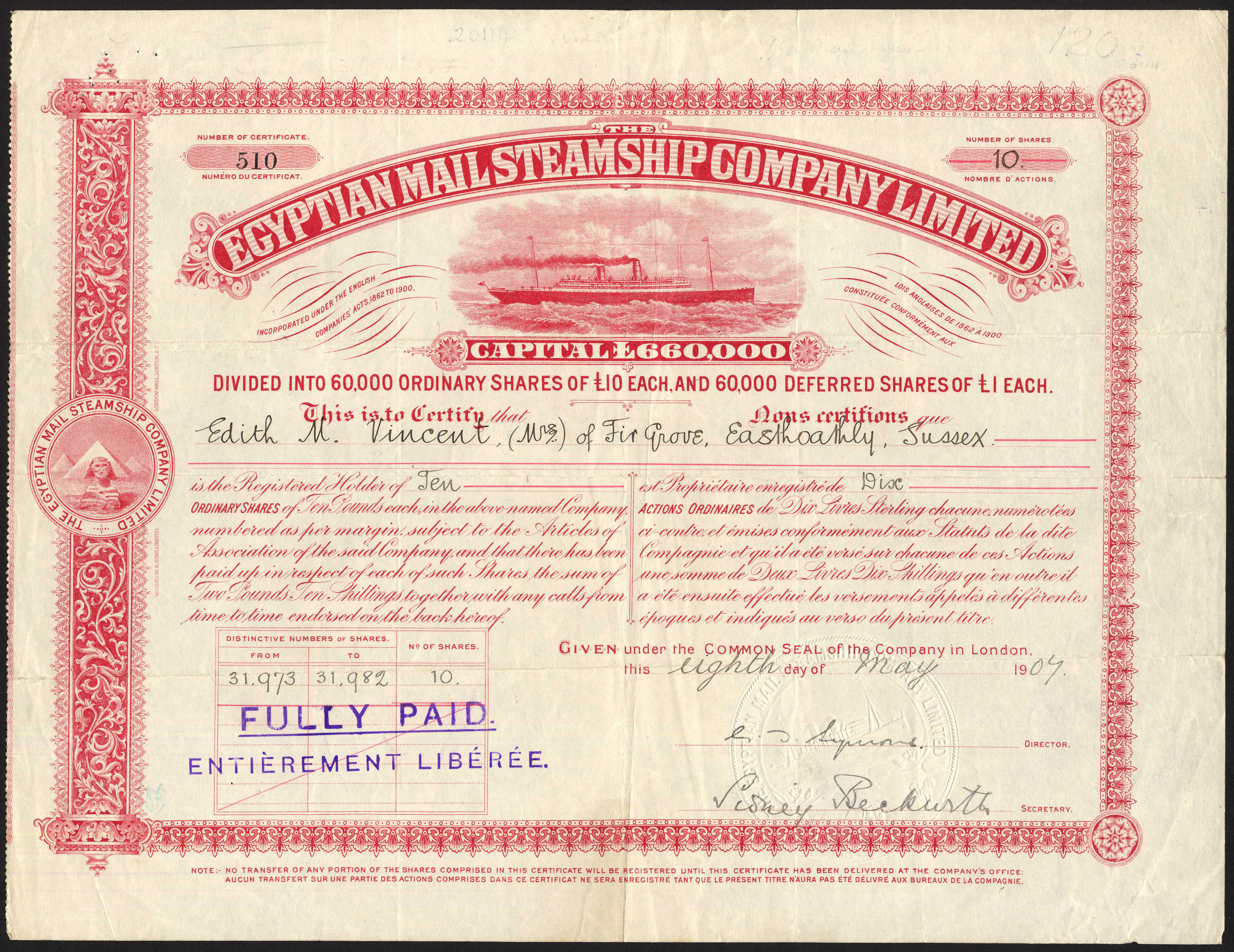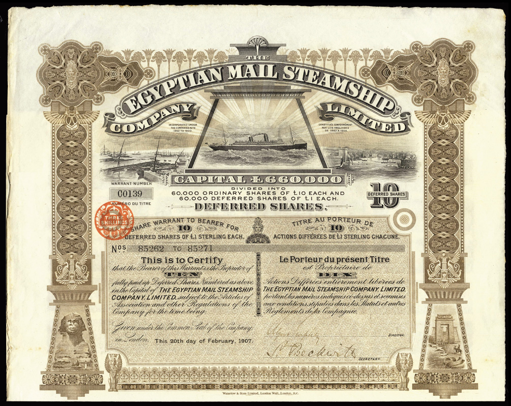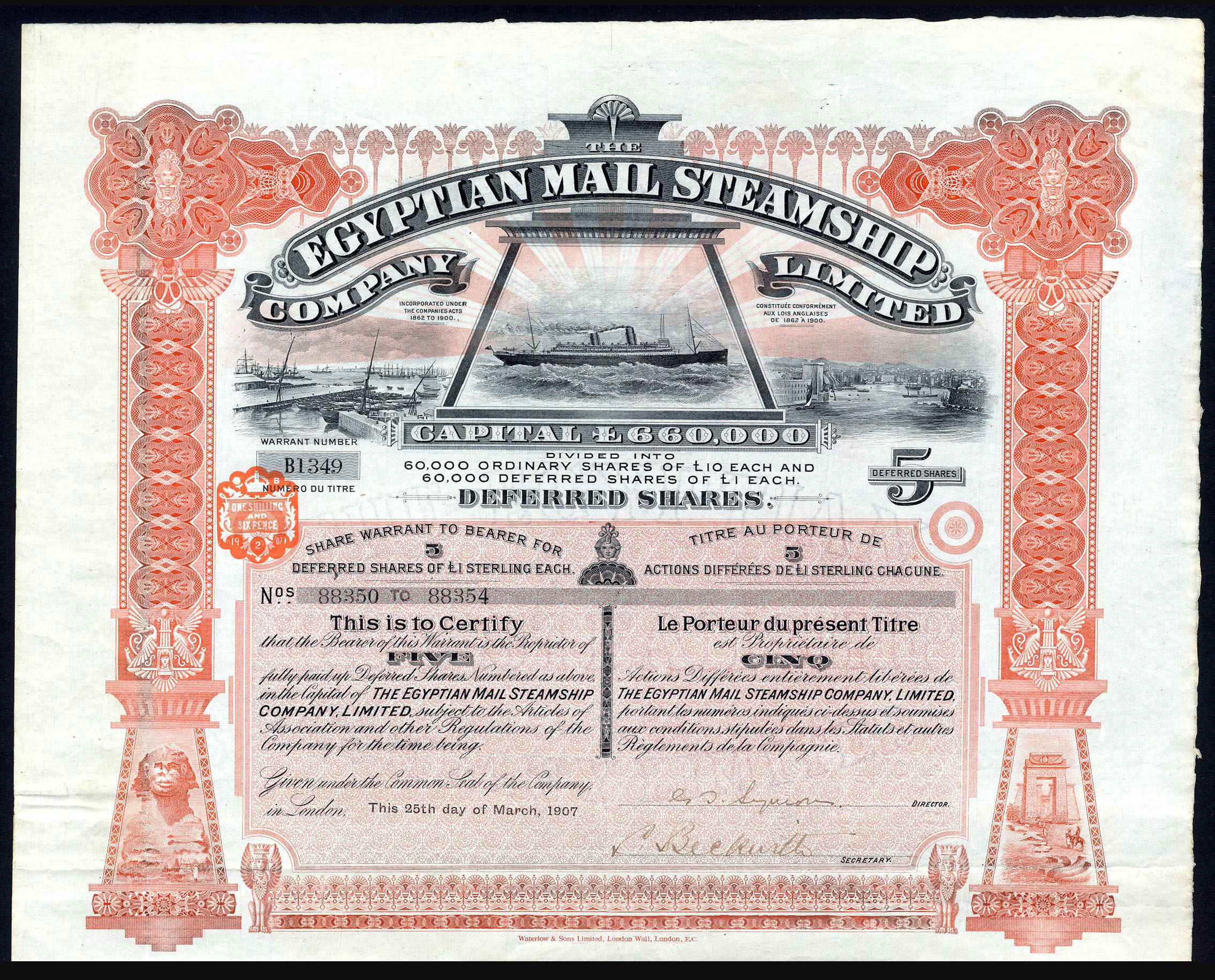 Registered 25th May 1906 and ordered two passenger ships named ‘Cairo’ and Heliopolis’ to operate them between Marseille and Alexandria. The board of directors included Lord Armstrong and Edouard Empain. The route was very competitive and the company was put into voluntary liquidation 7th July 1908 and the two ships put up for sale. Both acquired by Canadian Northern Steamships in 1910. Company number 88920.