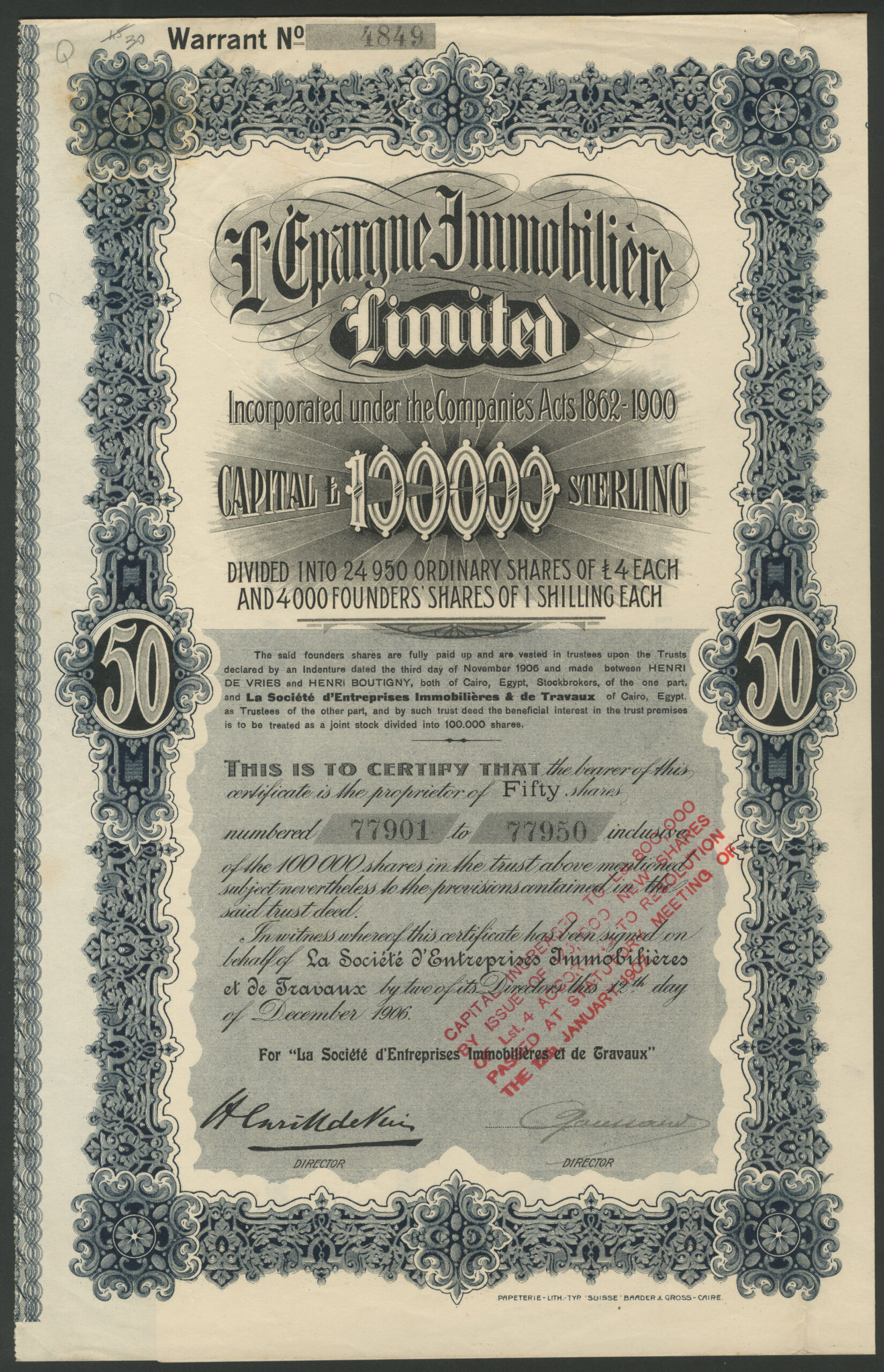 | 104 | 50 Shares | 1906, blue, with coupons | #4849 | £40 |