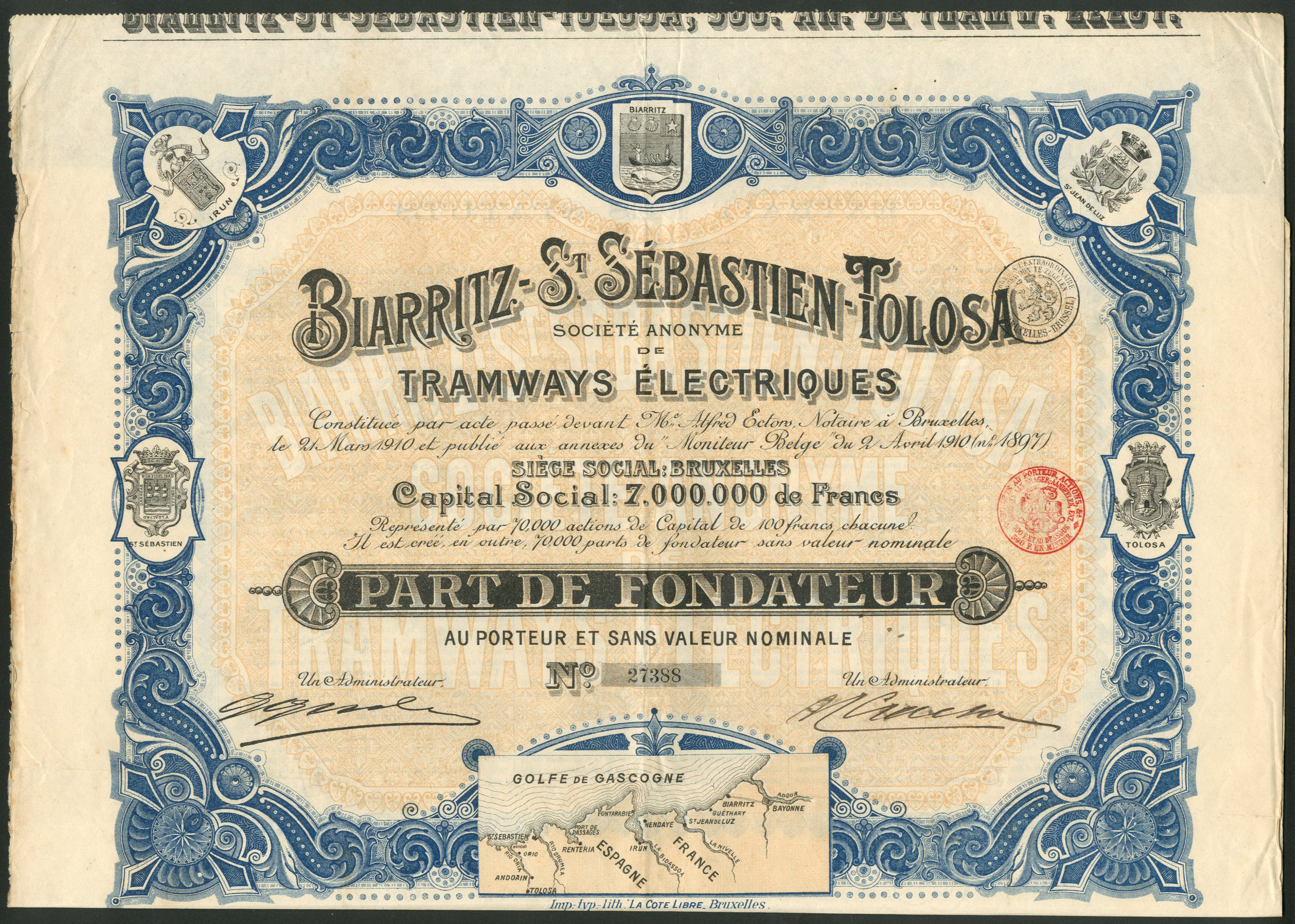 Constituted in Brussels 2nd April 1910 by the Empain group. Name changed to Chemins de Fer et Tramways Electriques des Basses Pyrenees et des Pays Basques.