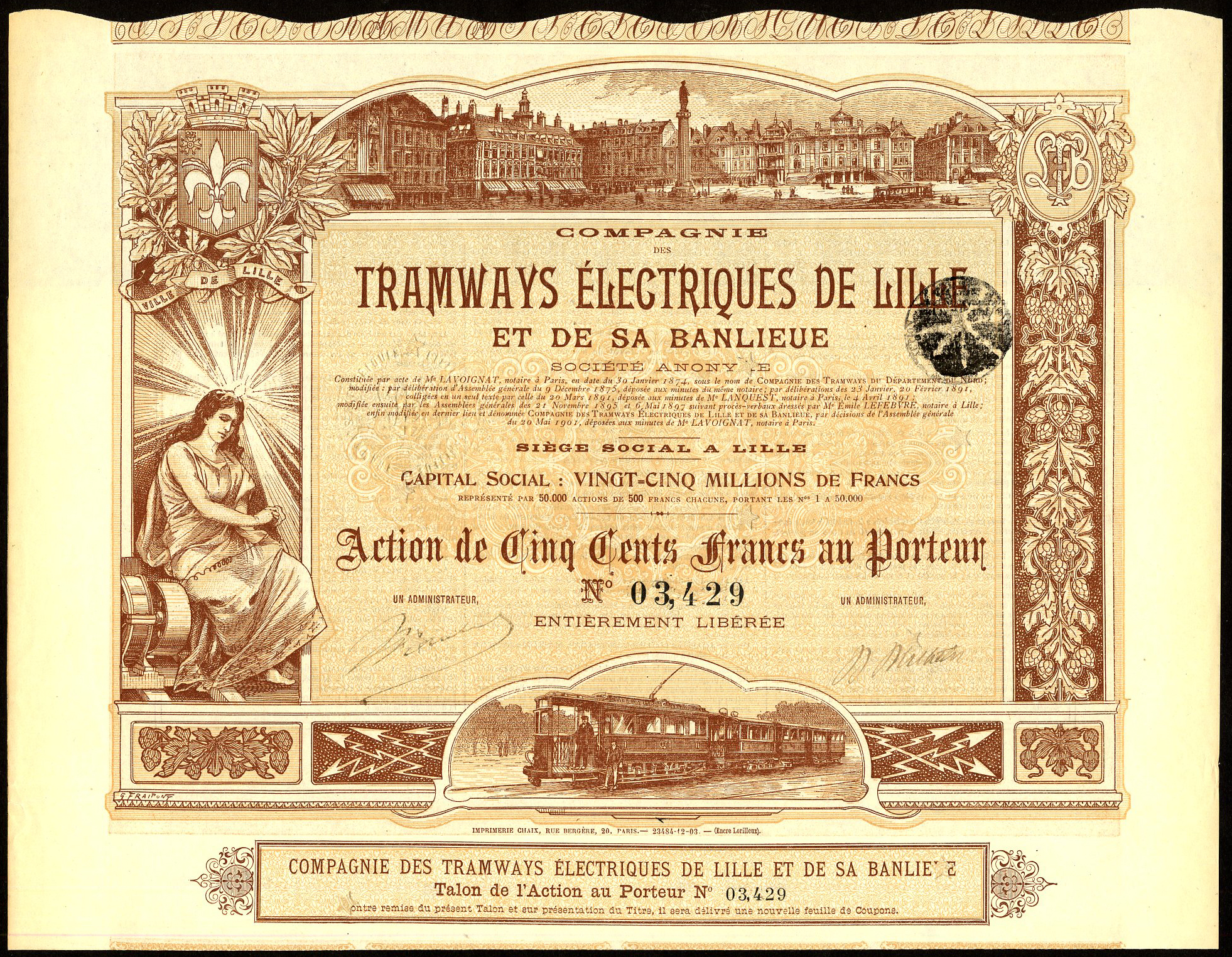 Capital 25,000,000 francs in shares of 500 francs.