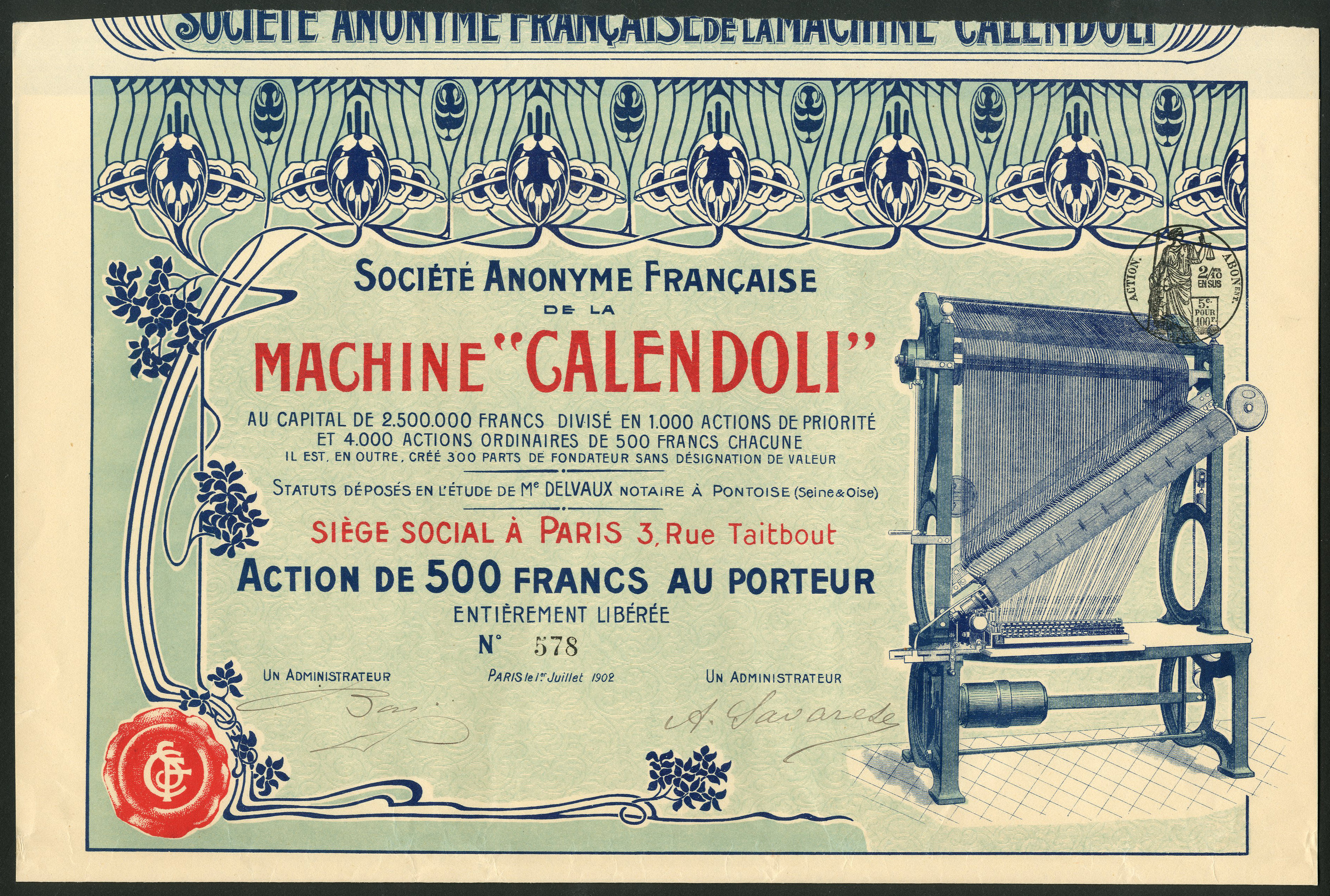 Formed in Paris prior to 1902. A lithographic type-bar machine invented by Father Calendoli, a Dominican Monk, in 1893. Capital 2,500,000 francs in 1000 priority shares, 4000 ordinary shares of 500 francs and 300 founders shares.