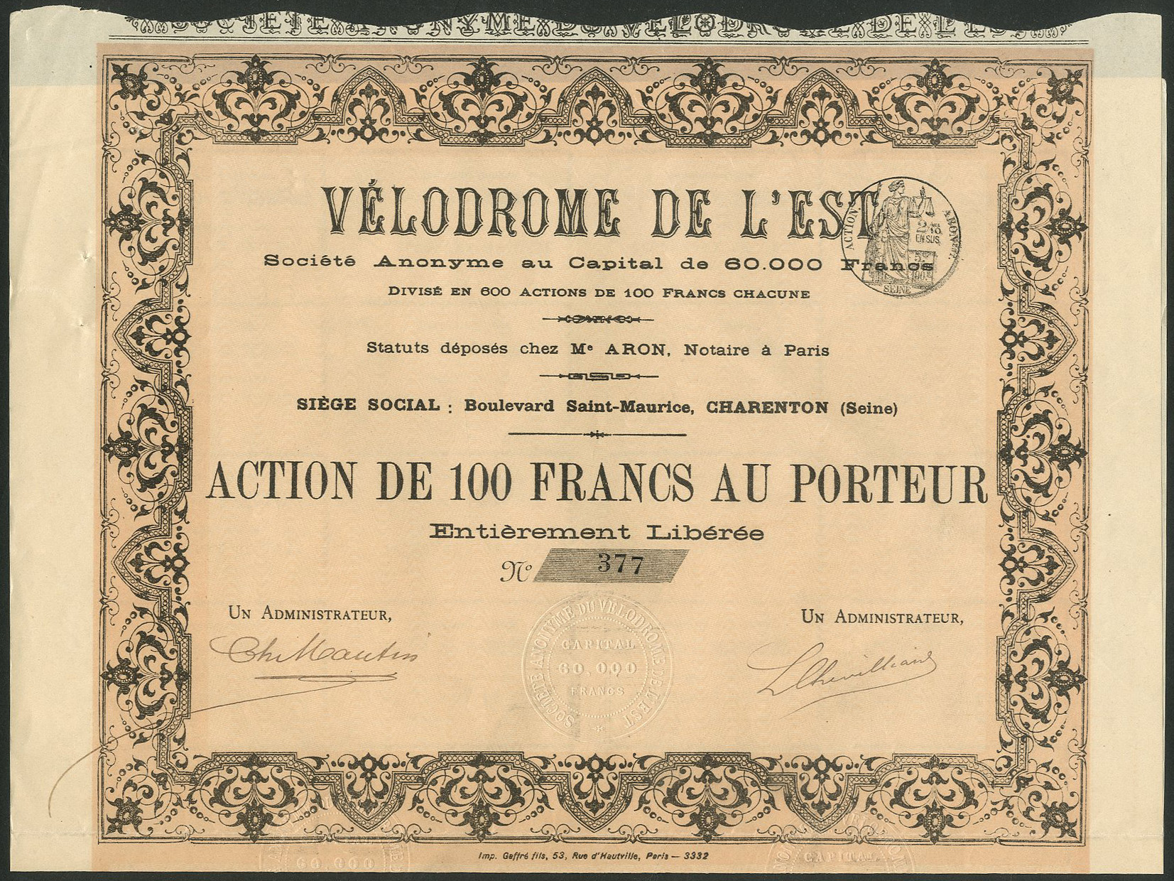 Capital 60,000 francs in shares of 100 francs.