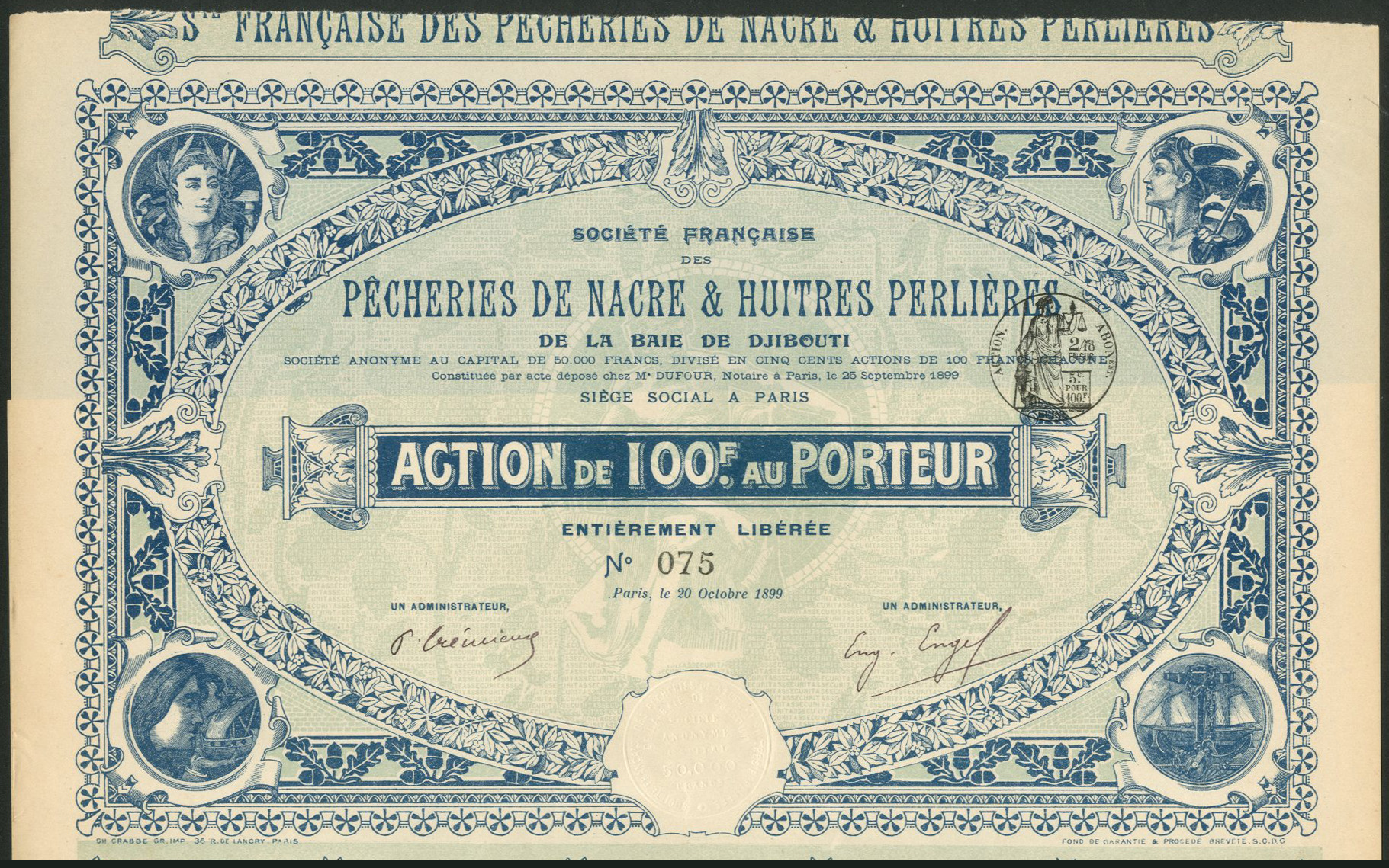 Formed in Paris 25th September 1899 to deal with mother of pearl and pearls in the bay of Djibouti.