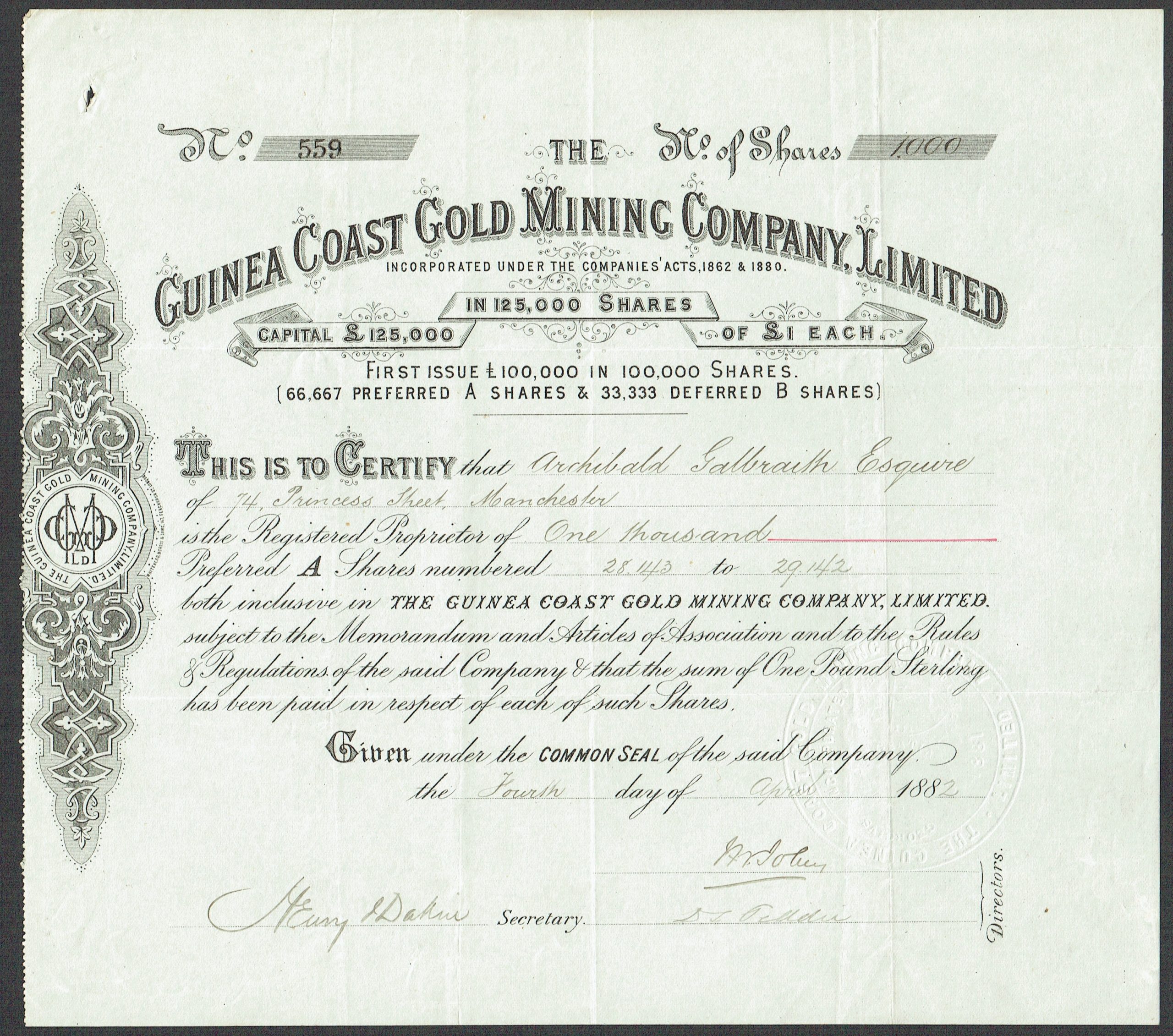 Registered 26th October 1881 to acquire a lease in the Ashanti district, Gold Coast Colony. In voluntary liquidation 31st July 1885. Company number 16002