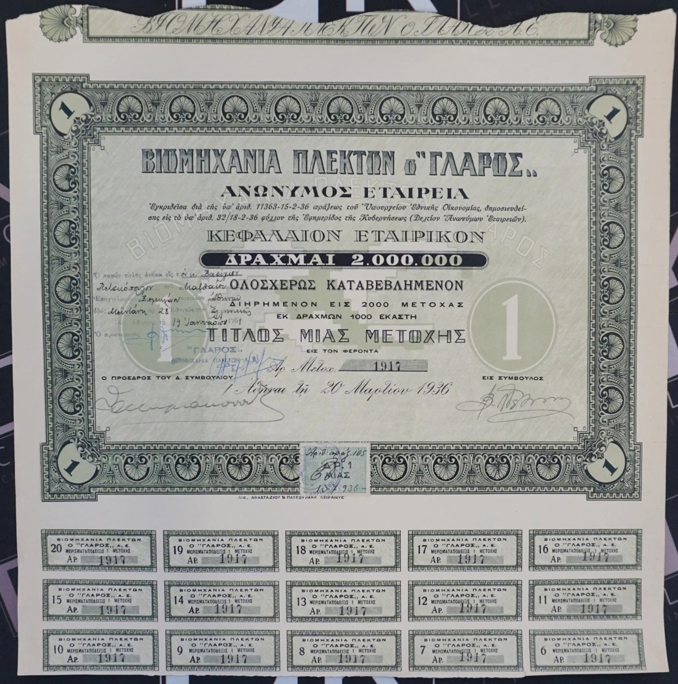 Formed in 1936. Capital 2,000,000 drachma in shares of 1000 drachma.
