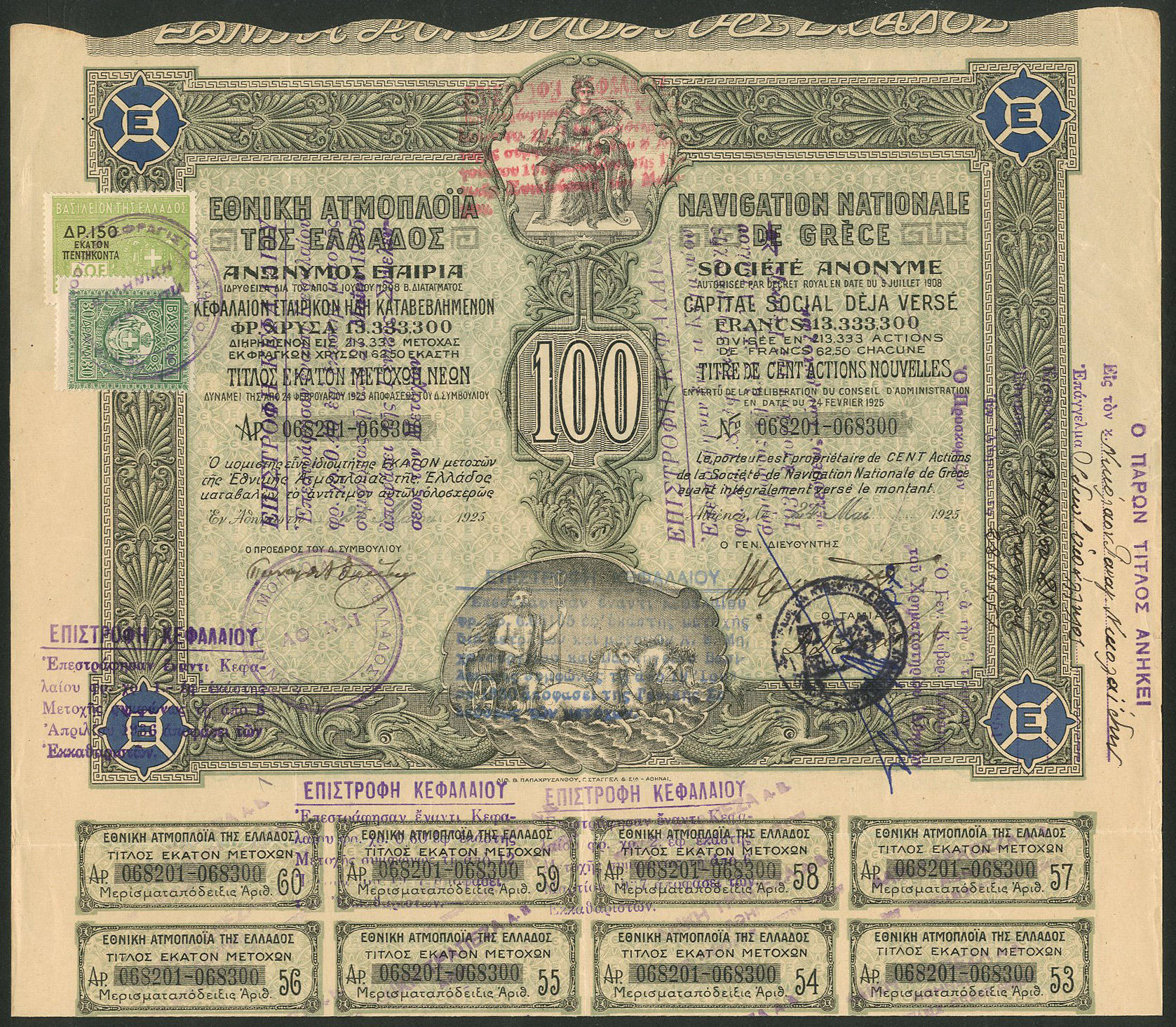| 102 | 100 Actions Nouvelles | 1925, green, with coupons | #68,201-300 | €30 |