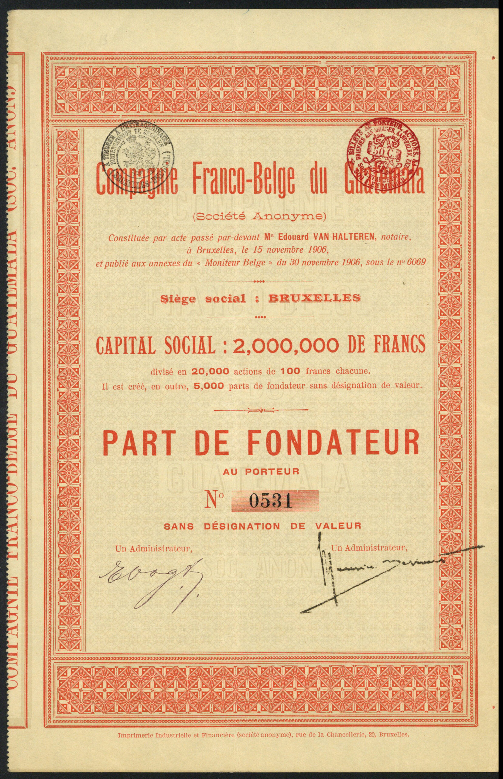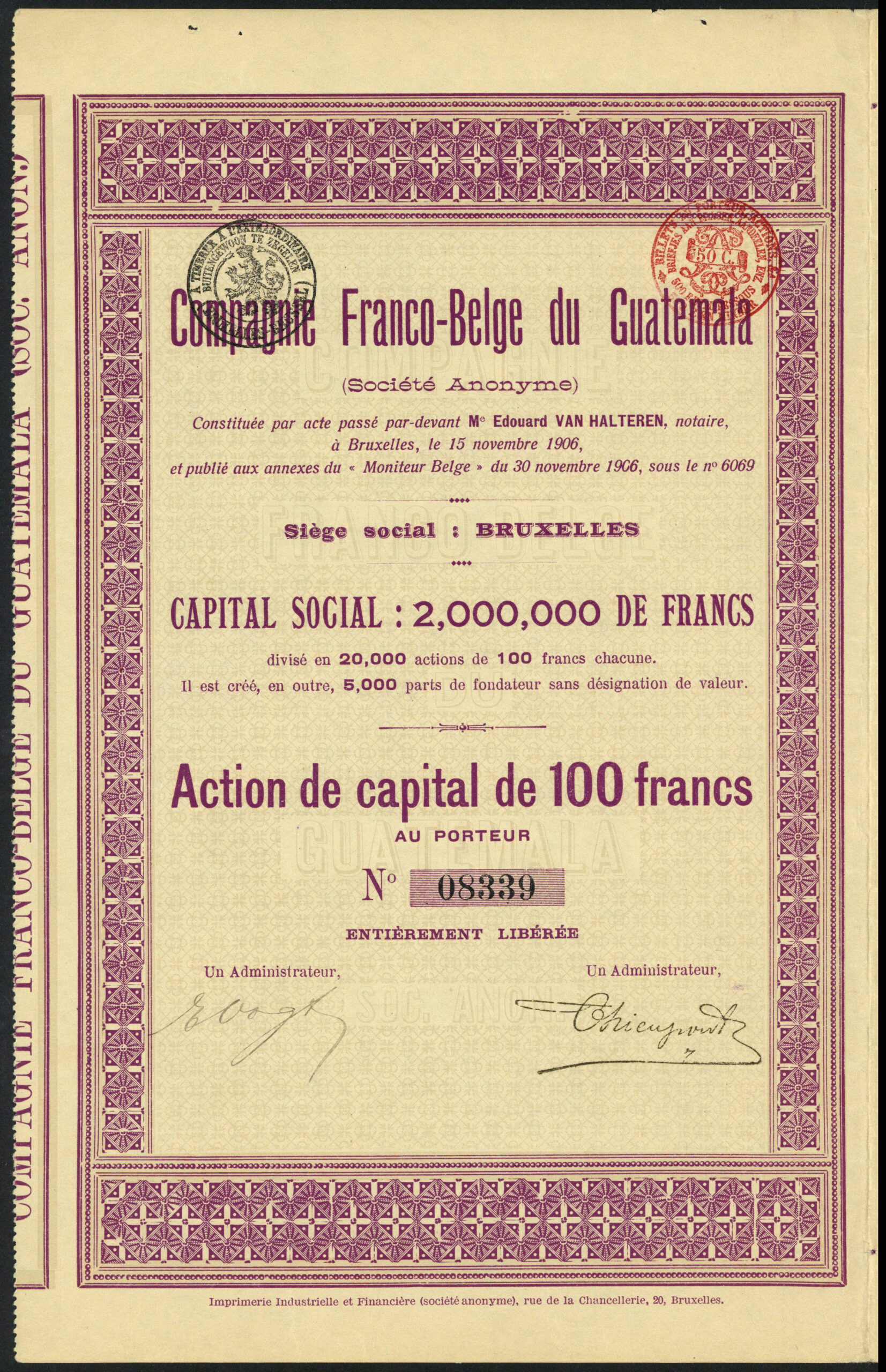 | 101 | Action de Capital | 1906, purple, with coupons | 20,000 | €15 |