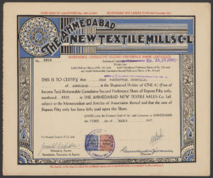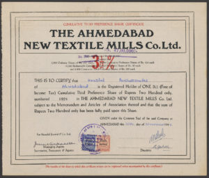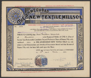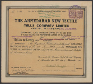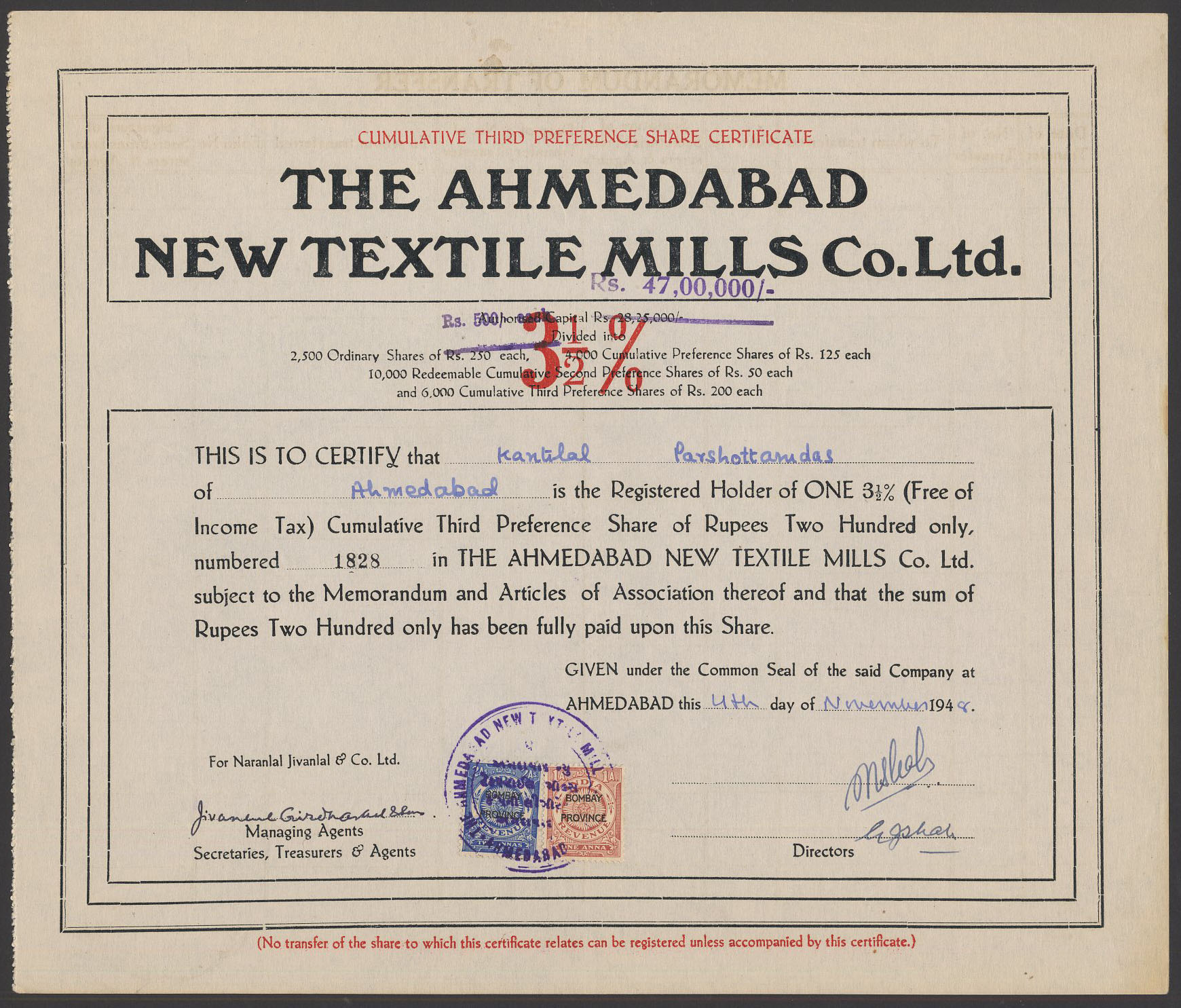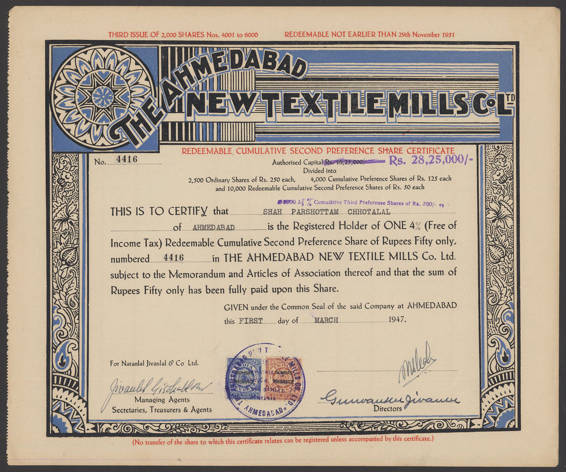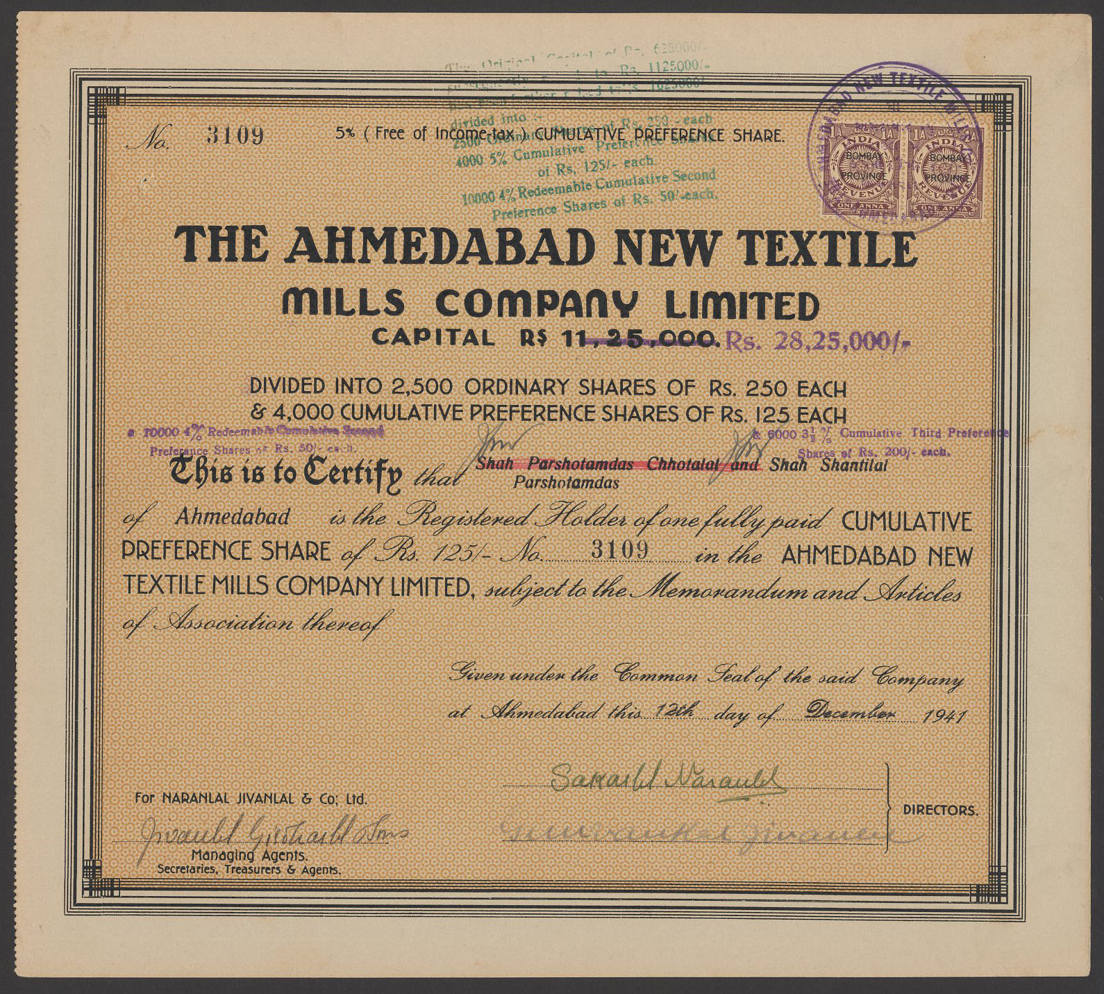 Capital 11,25,000 rupees in 2,500 ordinary shares of 250 rupees and 4,000 Cumulative Preference shares of 125 rupees. Increased by the addition of 10,000 4% Second Preference shares of 50 rupees and then 6,000 3½% Cumulative Third Preference shares of 200 rupees.