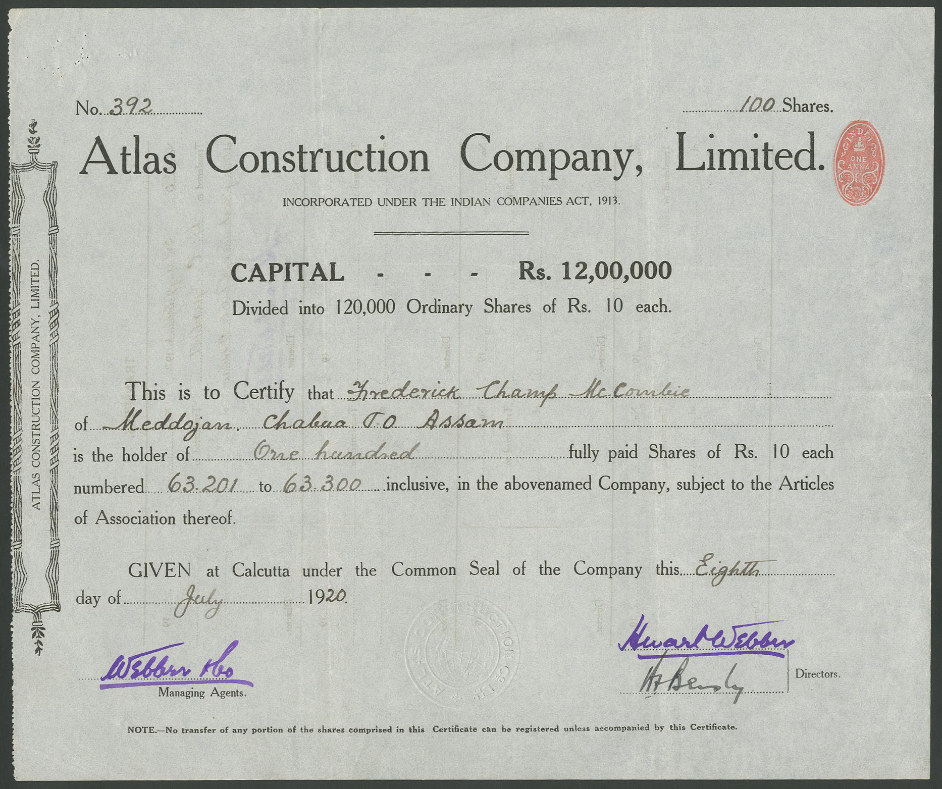 101 | 10 rupee shares | 19[20], black on grey | >392 | VF | £35 |