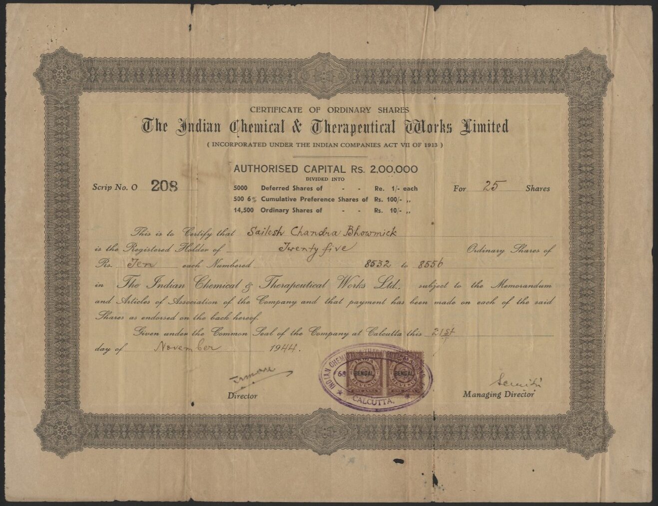 Capital 200,000 rupees in 14,500 Ordinary shares of 10 rupees, 500 6% Preference shares of 100 rupees and 5,000 Deferred shares of 1 rupee.