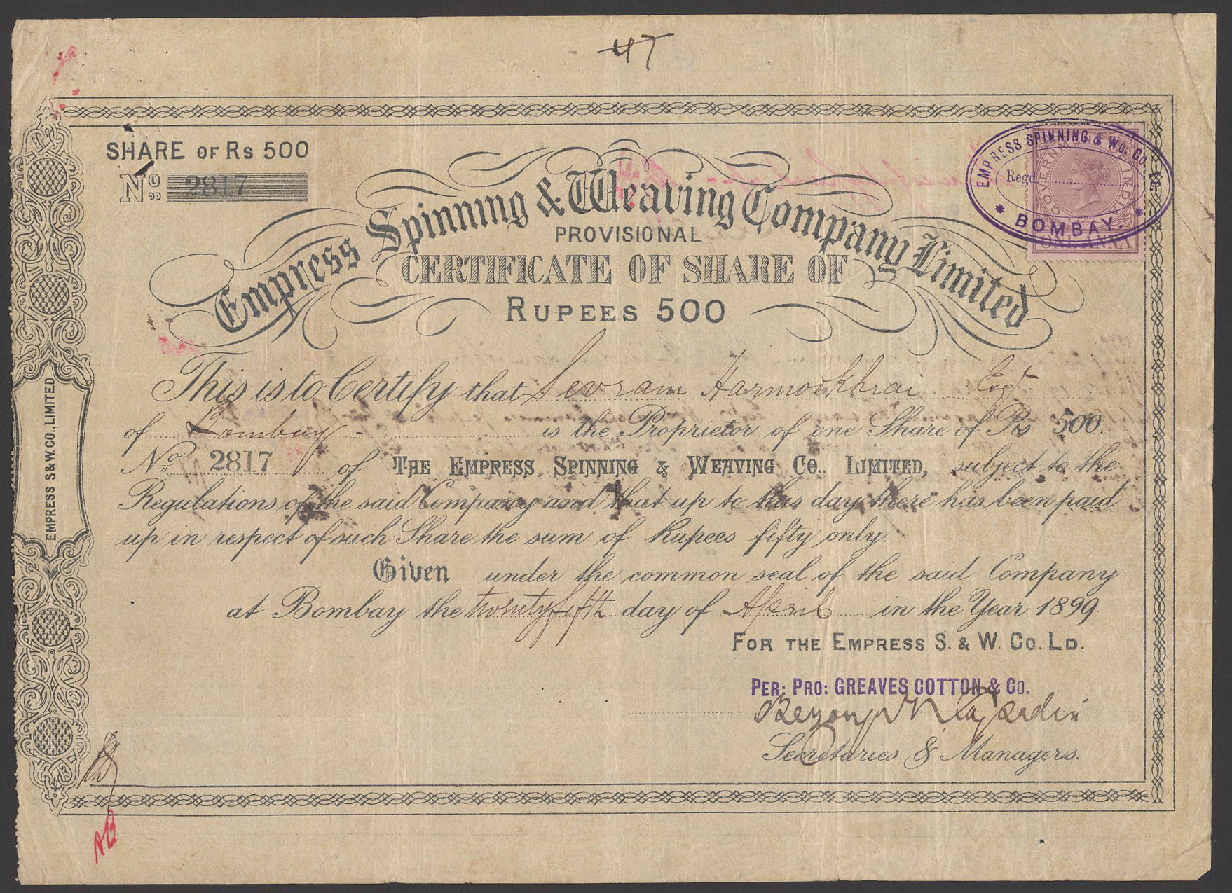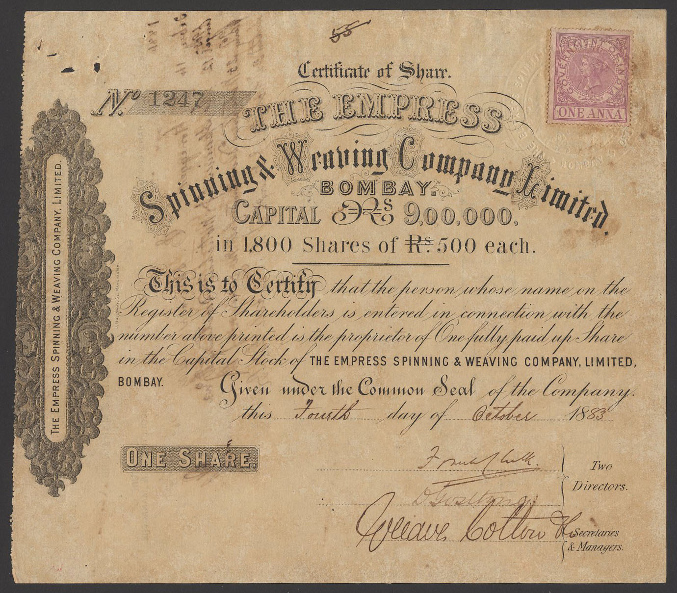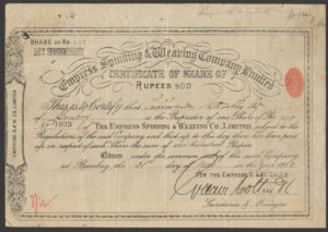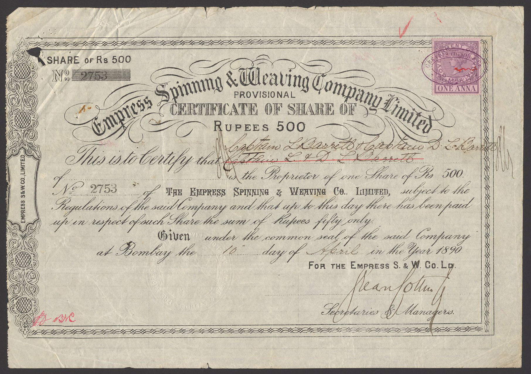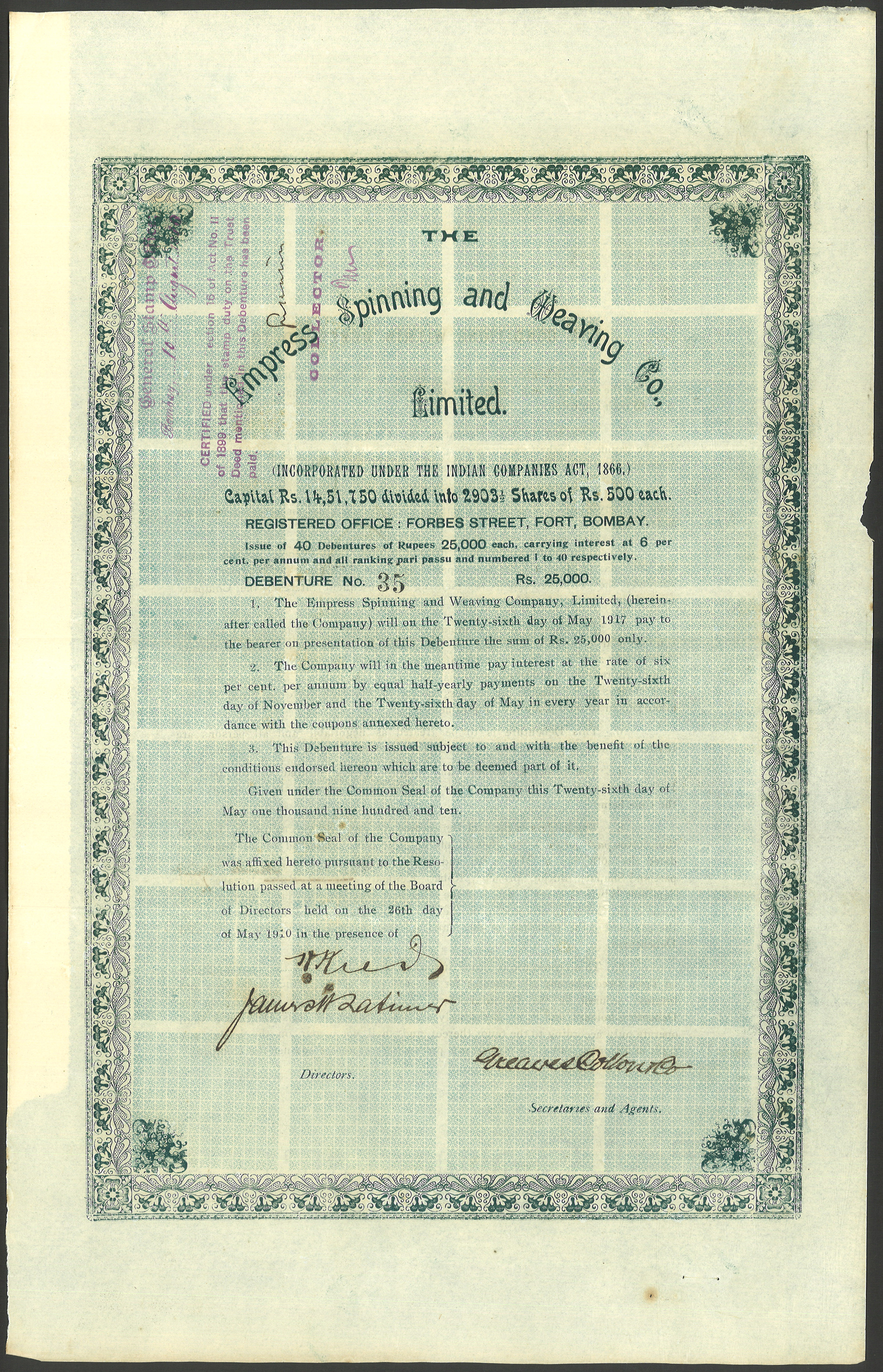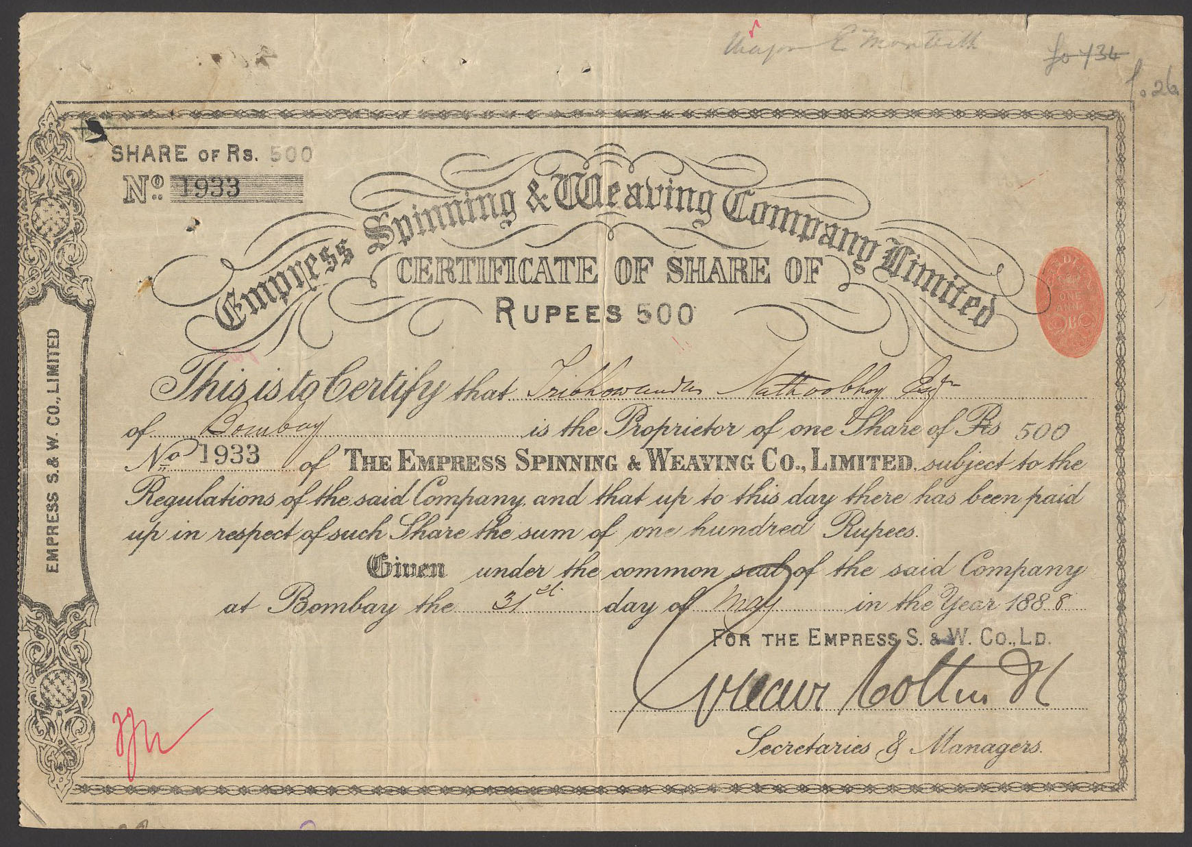 Capital 900,000 rupees in 1,800 shares of 500 rupees. Increased by 1910 to 14,51,750 rupees in 2903½ shares of 500 rupees.