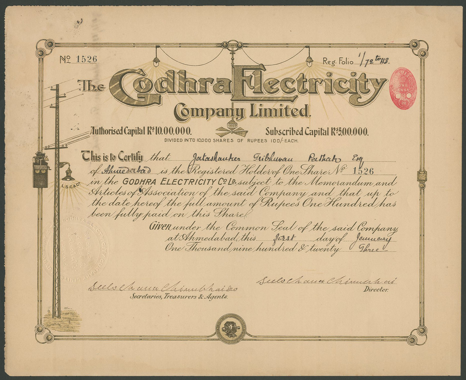Incorporated under the Indian Companies Act of 1913. Head office in Ahmedabad. Capital 10,00,000 rupees in shares of 100 rupees.