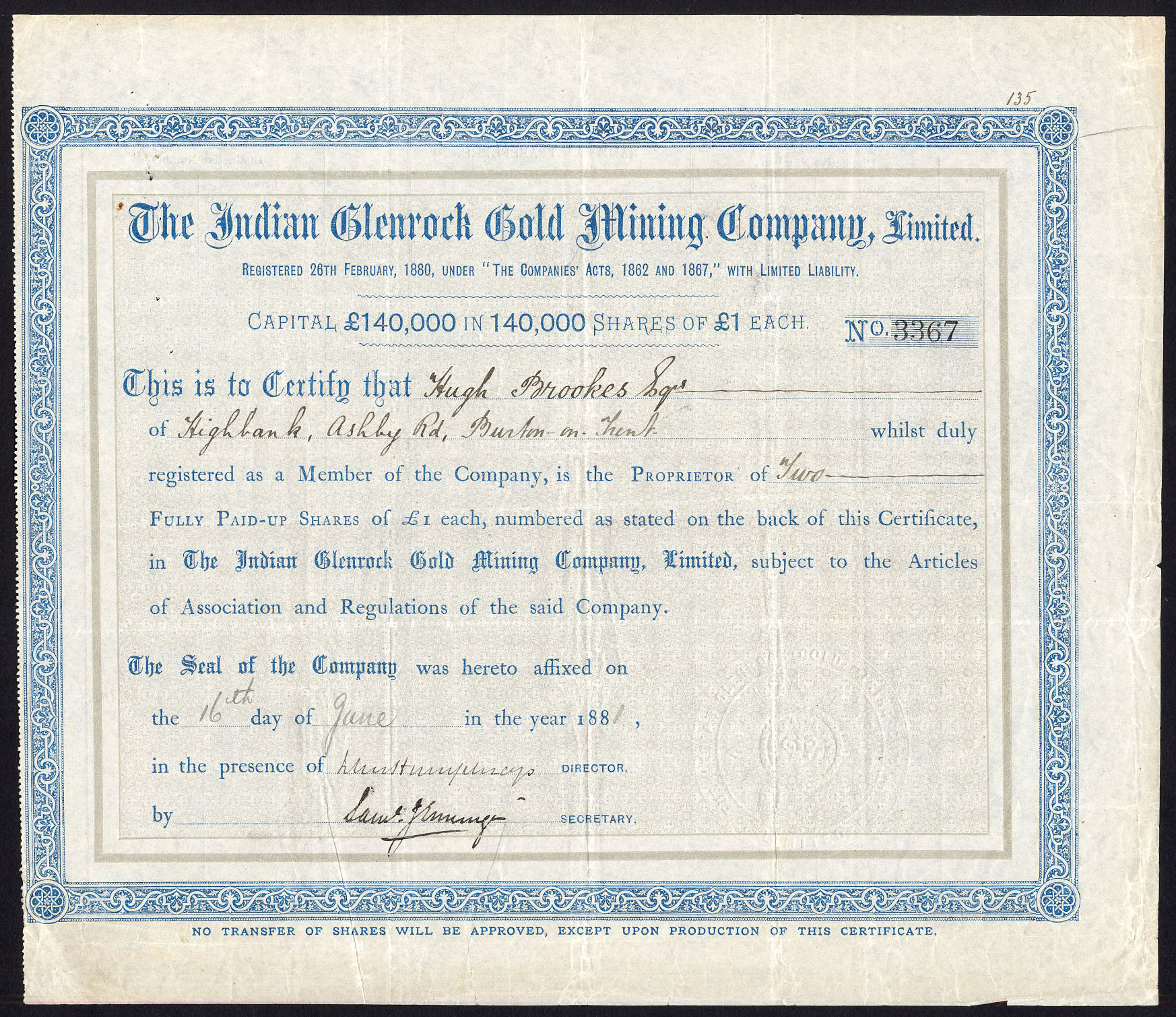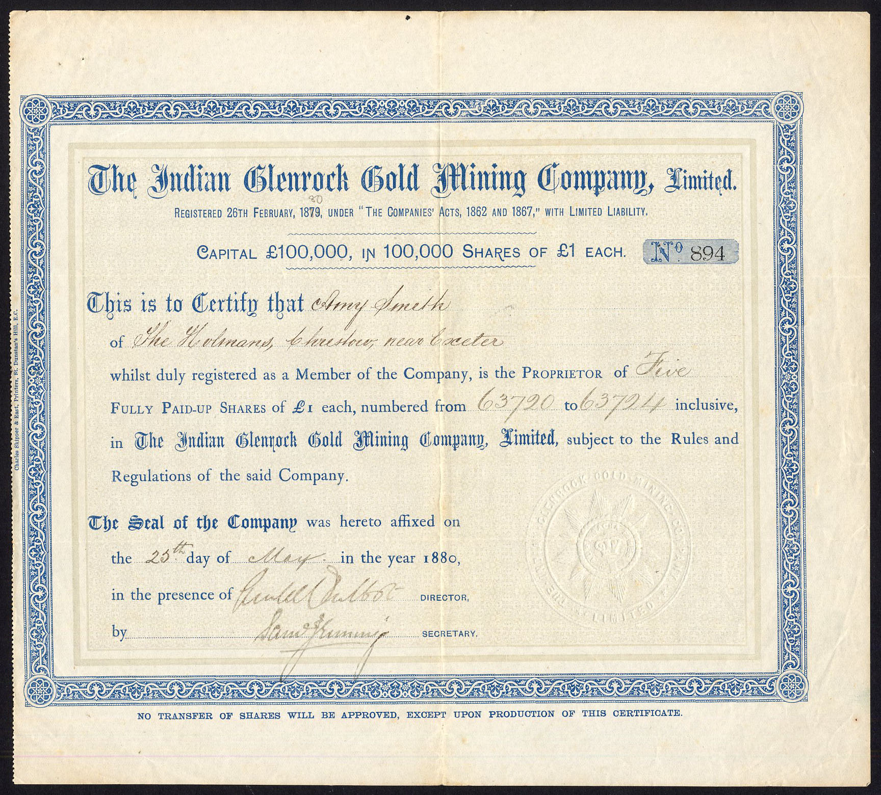 Registered 1880. Voluntary liquidation 12th February 1884. Property acquired by Glenrock Company Limited. Company number 13815