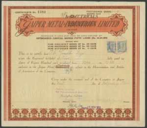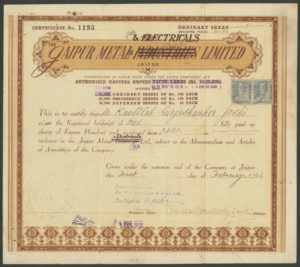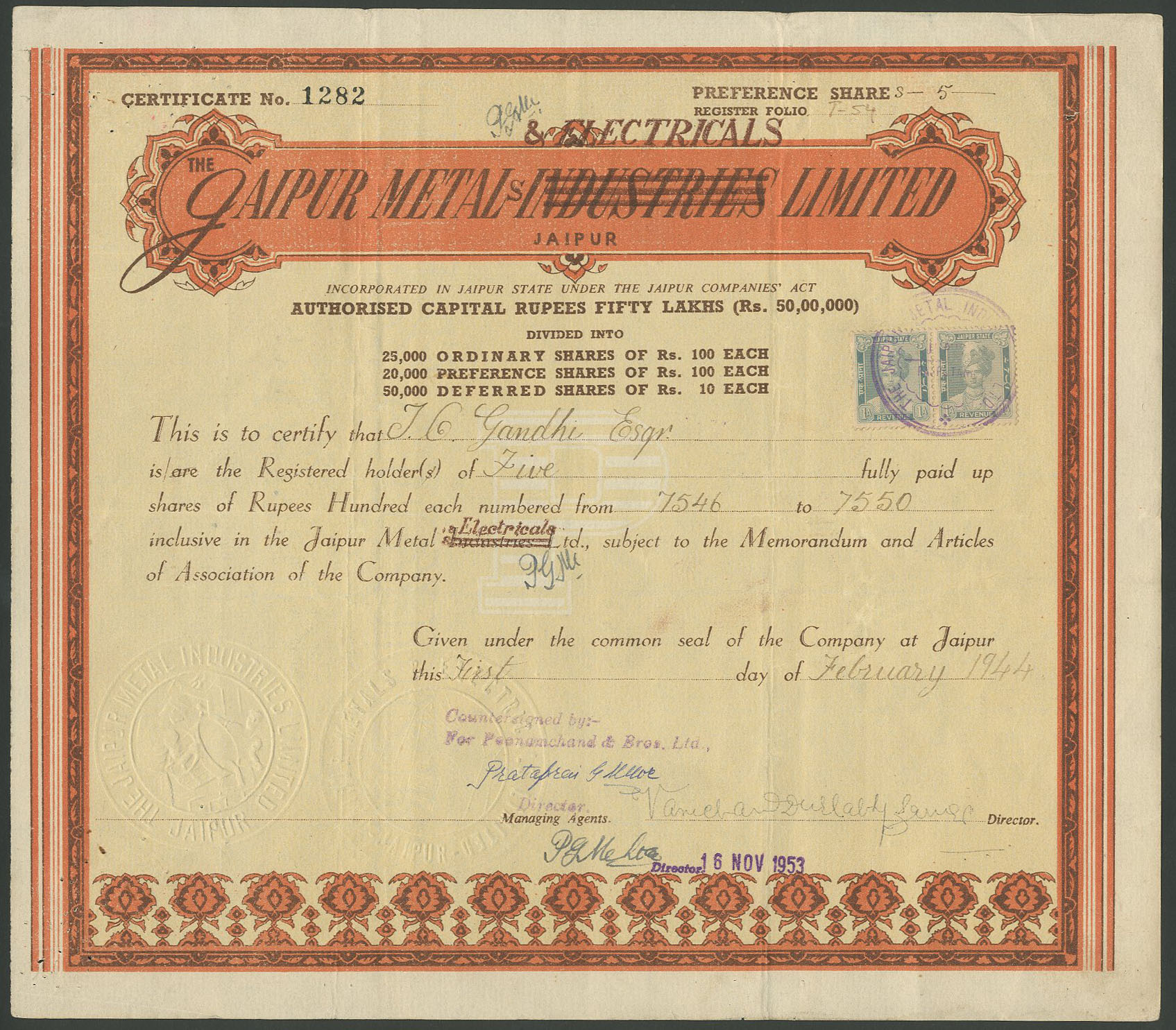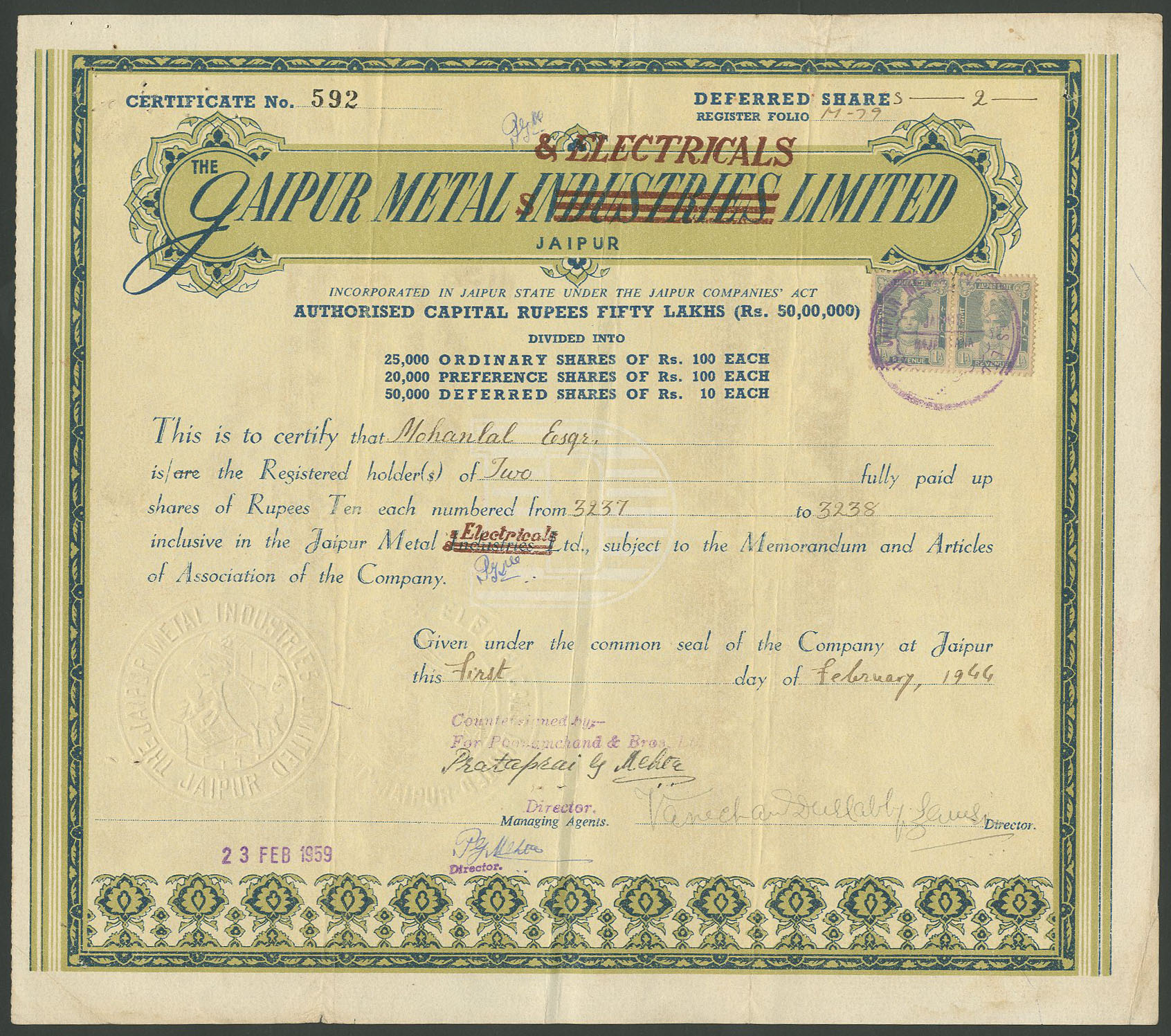 Incorporated under the Jaipur Companies Acts 1913. Originally Jaipur Metal Industries Limited, name changed to this.