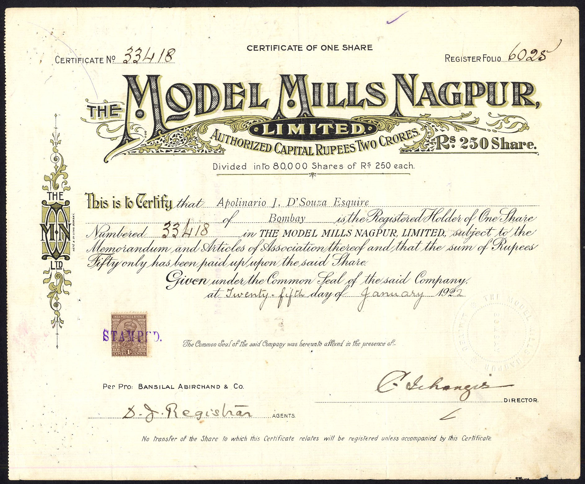 Incorporated under the Indian Companies Acts. Capital 2,00,00,000 rupees in shares of 250 rupees.