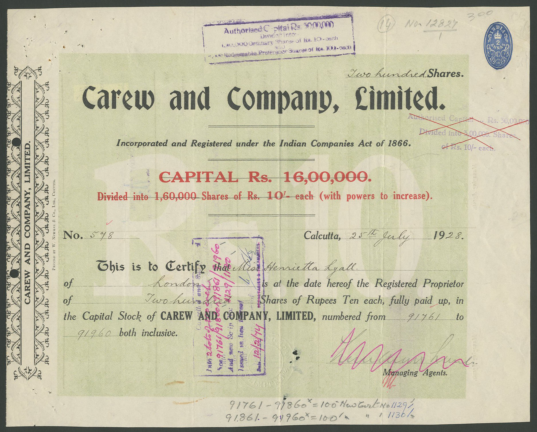 Capital 16,00,000 rupees in shares of 10 rupees. Later increased to 50,00,000 rupees in 4,20,000 ordinary shares of 10 rupees and 8,000 Redeemable Preference shares of 100 rupees.