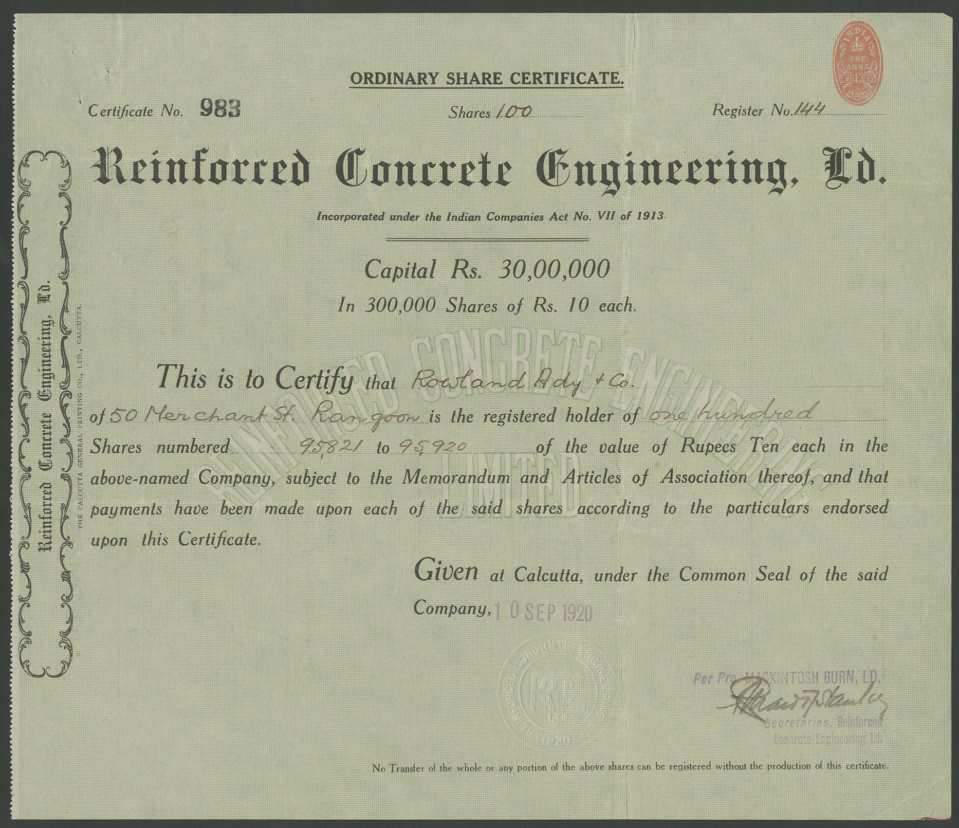 101 | 10 rupee shares | [1920], black, blue underprint | #295,#983 | £40 |