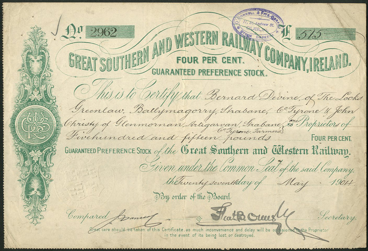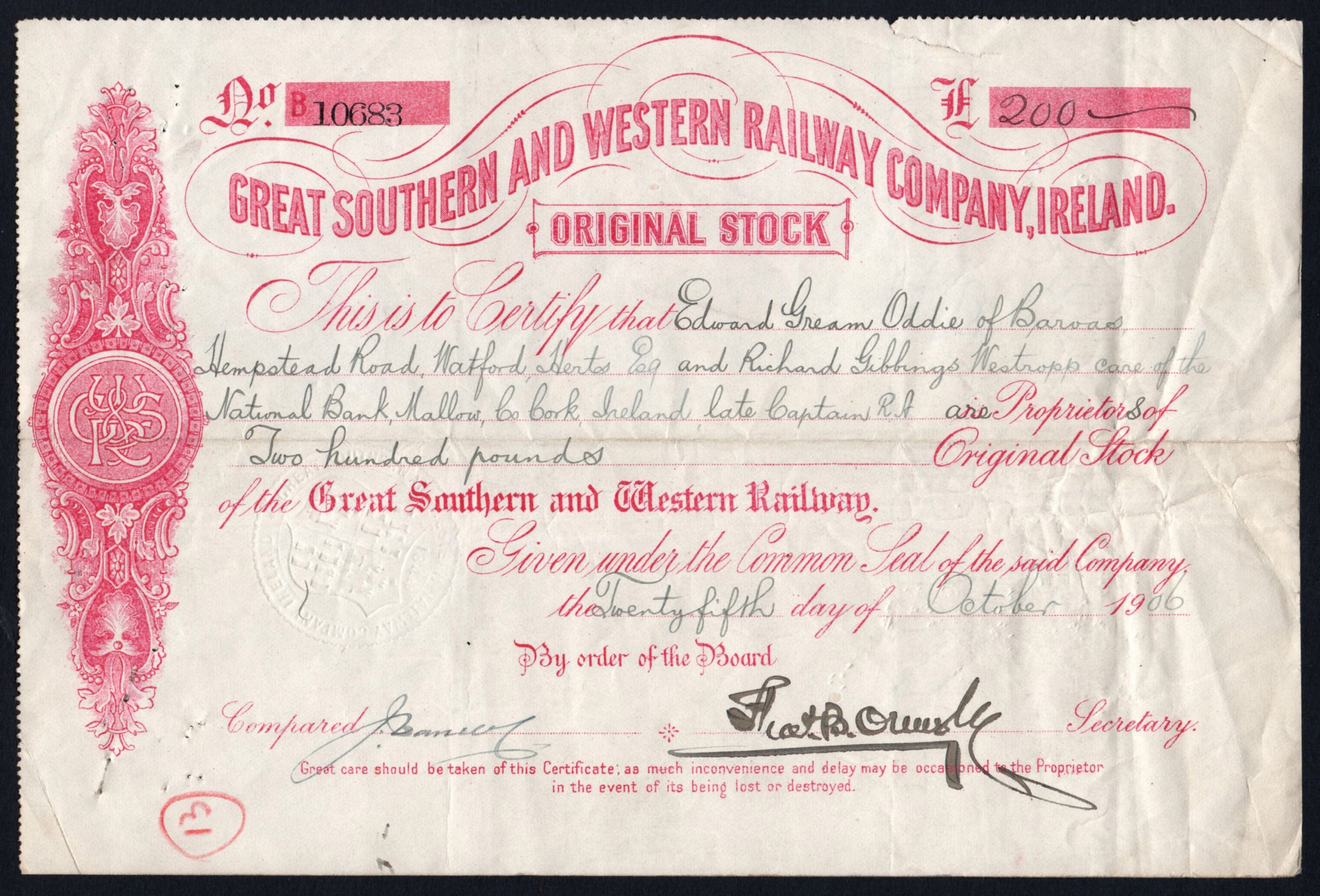 Incorporated on 6th August 1844. A 220 mile line running between Dublin and Cork, with two further branch lines. Built in the 5ft 3in gauge, it opened in 1846. The company subscribed to numerous other lines and leased or amalgamated with many, and together with the Midland and Great Western, and the Cork, Bandon and South Coast Railways, it formed the Great Southern Railway in 1924.
