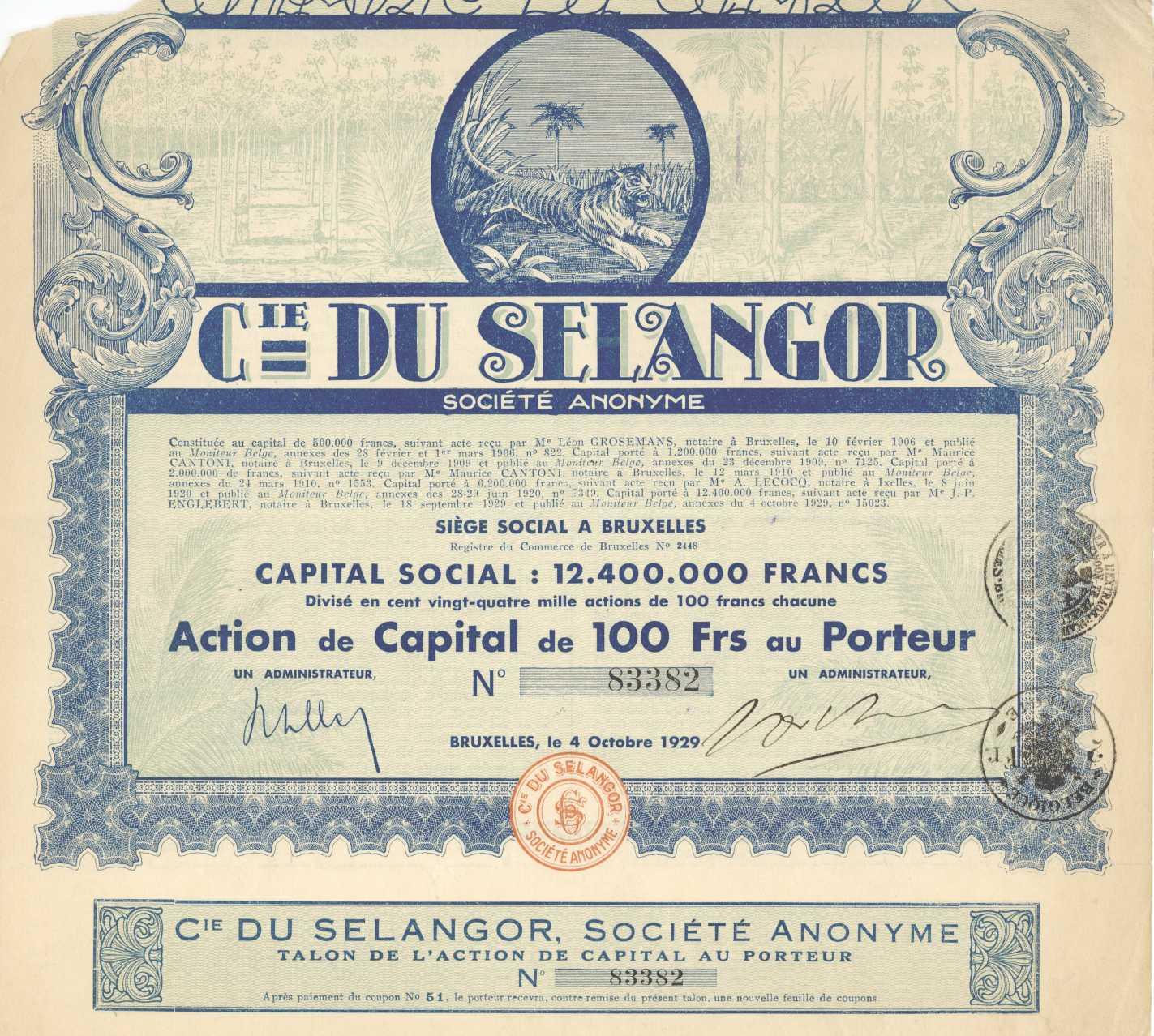 Formed in Brussels in 1906 to acquire the Sungei Rambat estate by the Kuala Selangor-Rawang railway in Selangor, 200 hectares of which were planted with rubber, coffee and coconuts. In 1920 the company acquired the neighbouring Bungsar Estate, of 780 hectares. (Boone Shares)