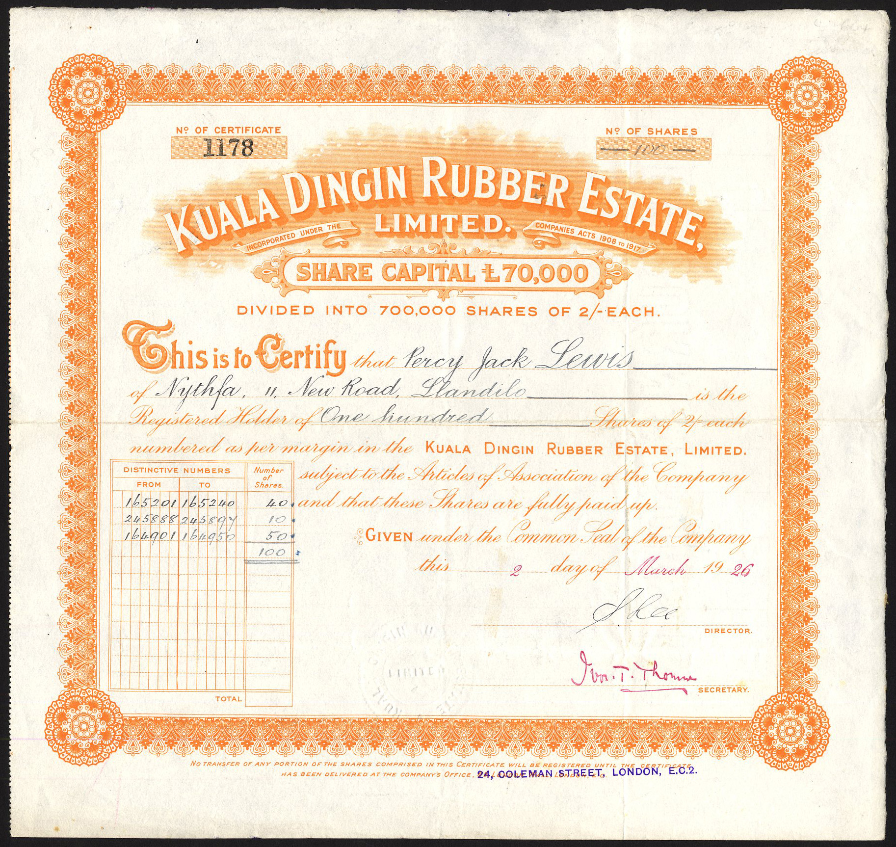 Capital £70,000 in shares of 2 shillings.