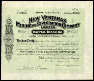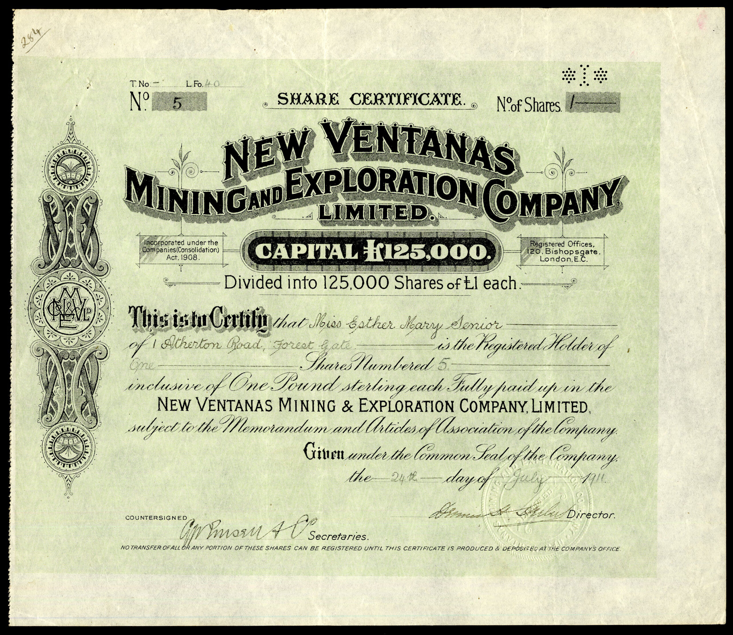 Registered 7th July 1911 as a reconstruction of the Ventanas Mining and Exploration Company Limited. Dissolved <1932. Company number 116697